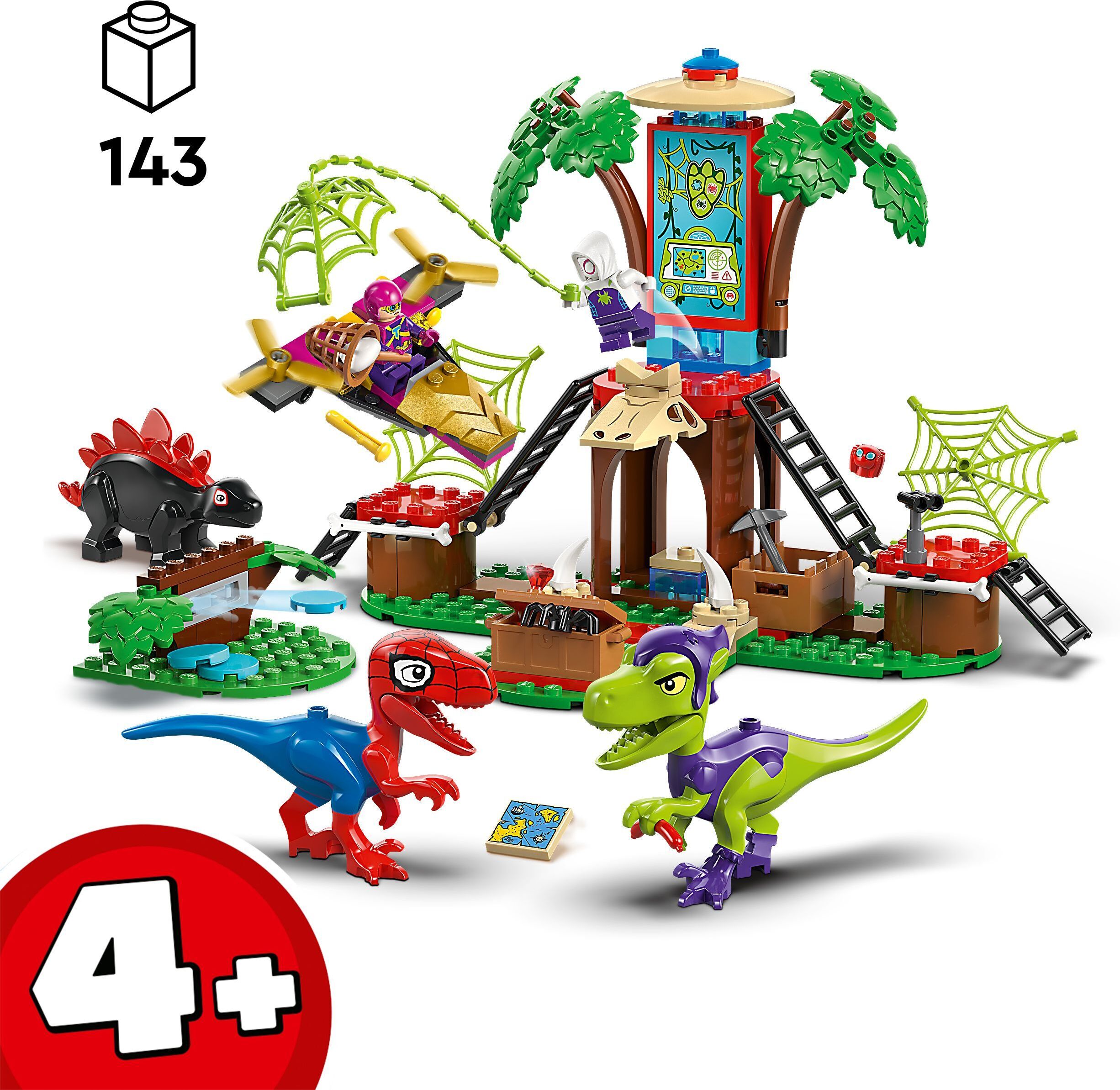LEGO Ämblikuvõrgu ja tema lahedate sõprade Ämblikuvõrgu ja Gobby õhulahingu superkangelase komplekt puumajas sisaldab stegosauruse ja raptori dinosauruse figuure.