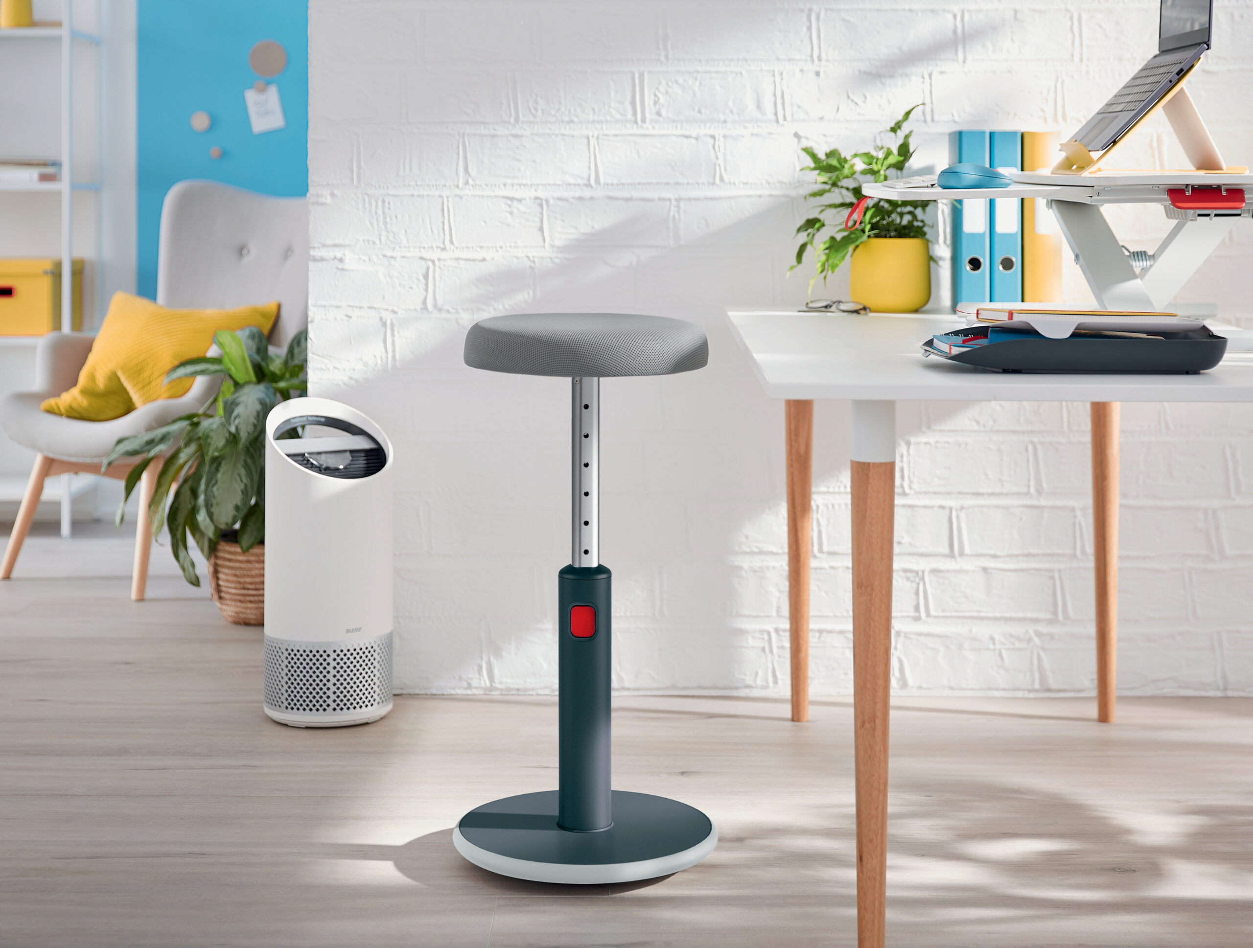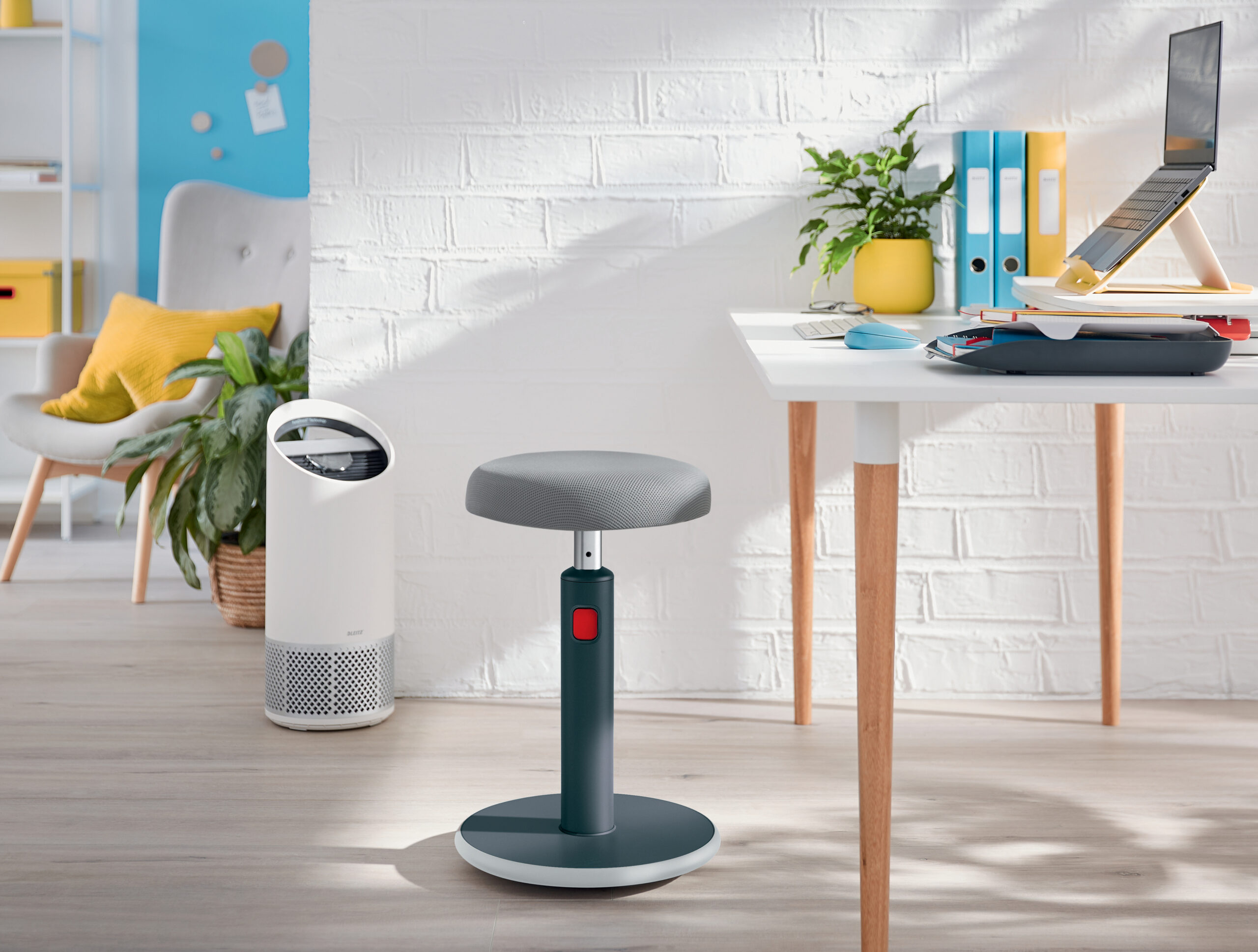 Leitz Ergo aktiivtool võimaldab töötamise ajal paindlikult istumis- ja seismisasendi vahel liikuda. Ümar alus soodustab aktiivset liikumist pööramise ja kiigutamise teel, tugevdades samal ajal selga.