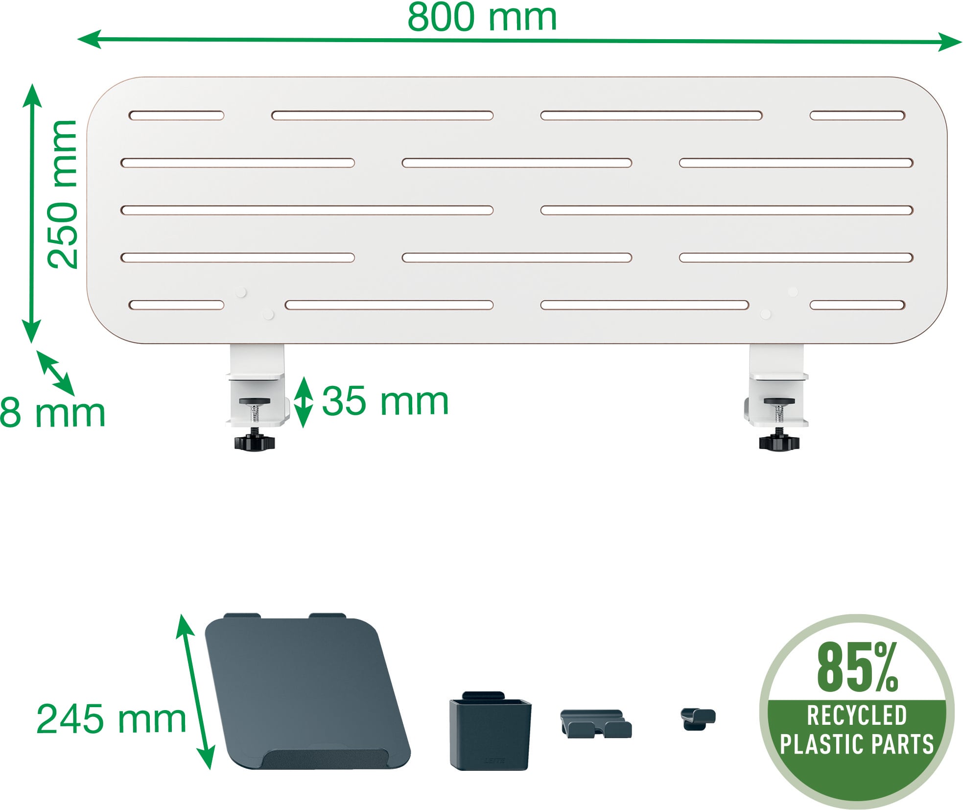 Neid ainulaadseid hoiualuseid on lihtne igale lauale kinnitada ja need tõstavad sülearvuti ekraani (kuni 15-tollised sülearvutid maksimaalse sügavusega 245 mm) ideaalsele kõrgusele. See aitab vältida kaela- ja seljavalusid töötamise ajal. See loob ka suurepärase vertikaalse hoiuruumi kõrvaklappide, märkmike, telefonide ja pliiatsite jaoks ning muu jaoks. Hoia asjad korras, kergesti leitavad ja vabasta väärtuslikku lauaruumi, luues samal ajal ergonoomilise töökoha.