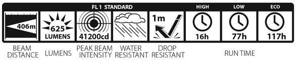 Jõudlus vastavalt ANSI FL1 standardile: Valgusulatus 403 m, valgusvoog 625 luumenit, valgustugevus 40 596 kandelat. Põlemisaeg täisvõimsusel 32 tundi, madala võimsusega seadistusel 112 tundi ja ökorežiimil 298 tundi (pärast seda on alles 10% algsest valgustugevusest. Praktikas põleb lamp pidevalt päeval ja öösel umbes paar nädalat kasutatava kiirega, kuni aku pinge on 0,99 V, mis teeb sellest oma suurusklassis turu energiatõhusaima lambi!). Pritsmekindel IPX4. Löögikindel 1 m kõrguselt.