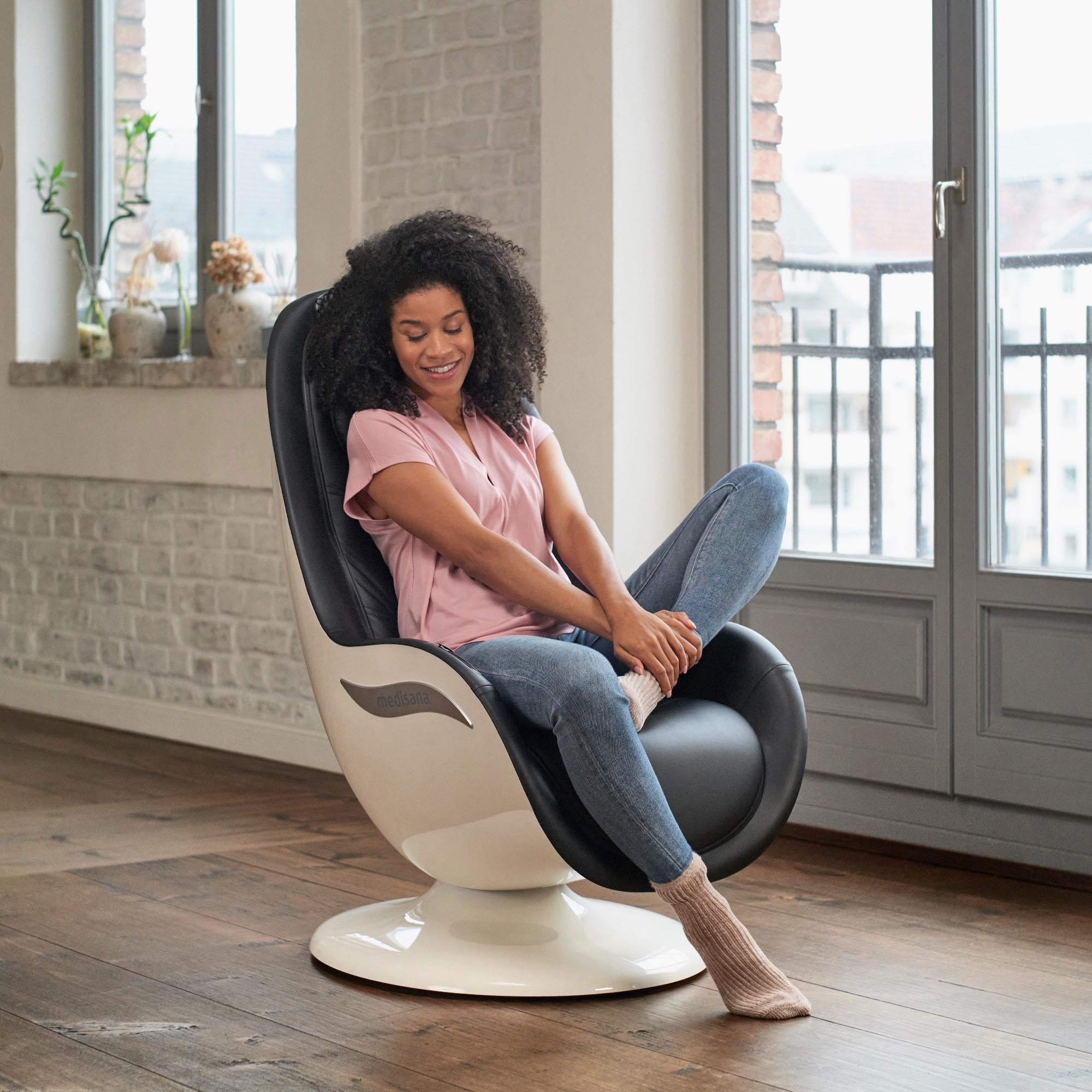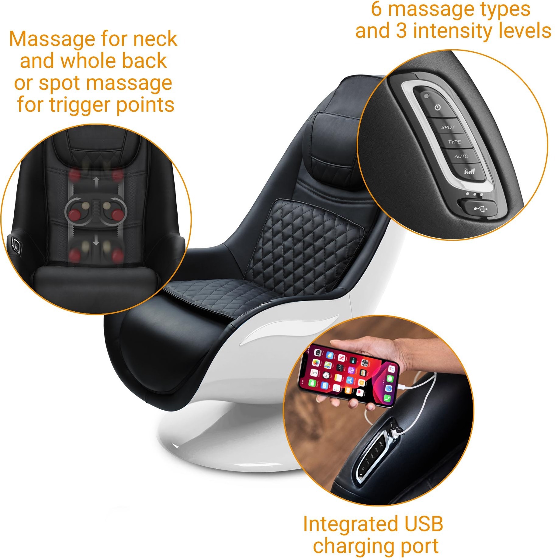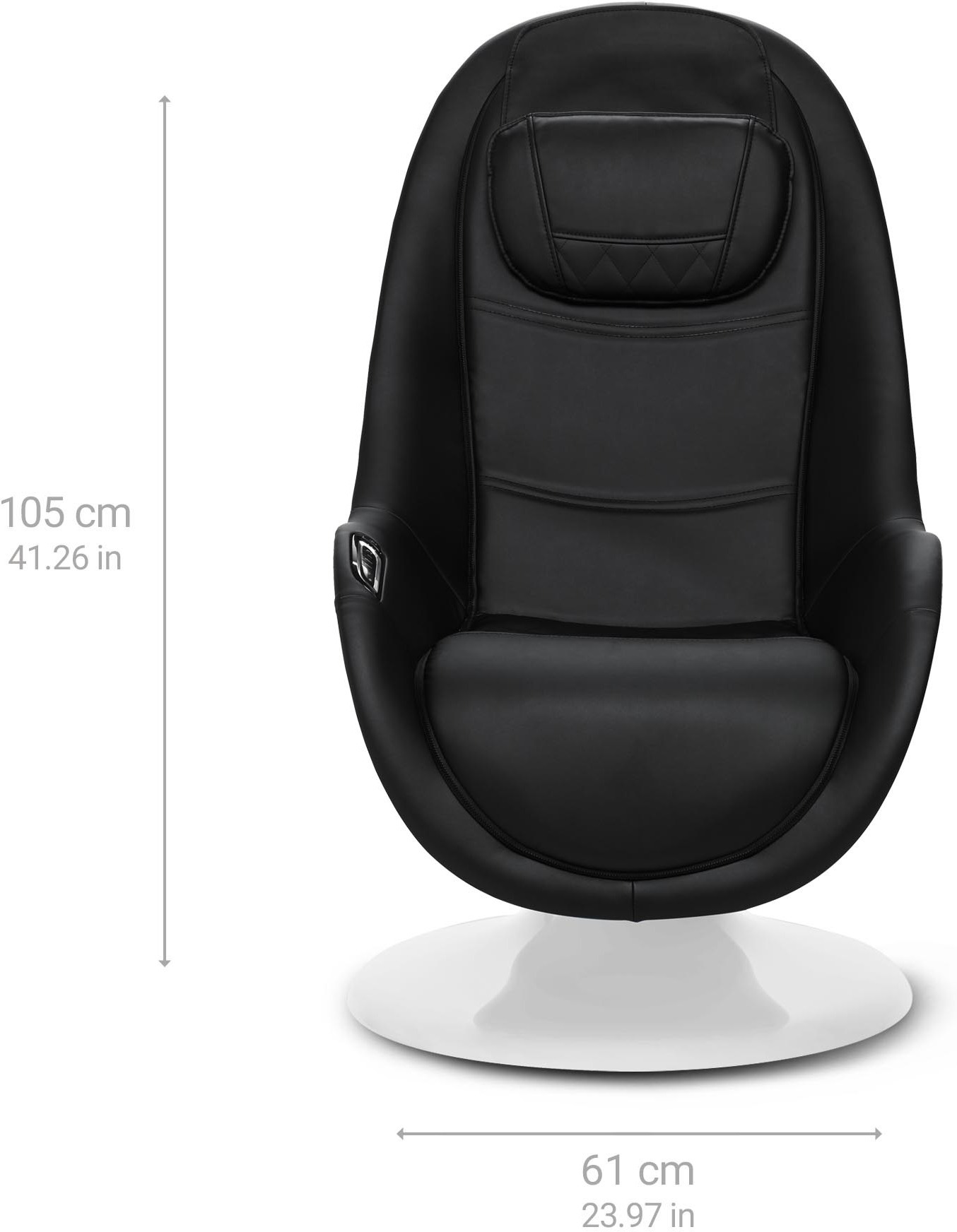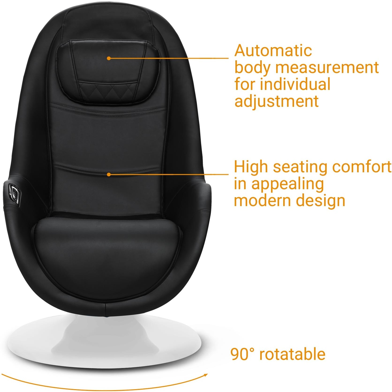 Toimintojen ohjaus on integroitu käsitukeen ja tässä samassa on myös USB-latausportti. Jos haluat nauttia pelkästään tuolin istumismukavuudesta ilman hierontatoimintoja, laitat vain istuin-, sekä niskatyynyn paikoilleen, nämä tulevat pakkauksen mukana. Tuolin jalka on 90 ° kääntyvä ja virtajohto irrotettava. Paitsi kompaktin kokoinen ja tyylikäs, on nojatuoli myös todella tehokas hieroja ja miellyttävä istua. Lisävarusteena saatavissa samaan sarjaan kuuluva rahi.