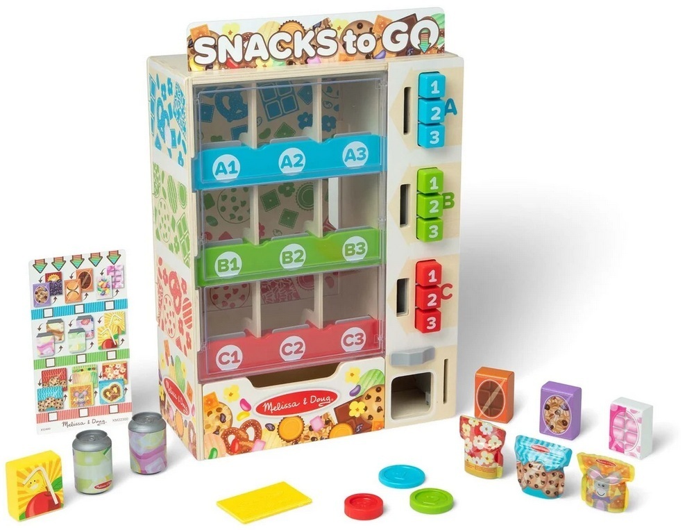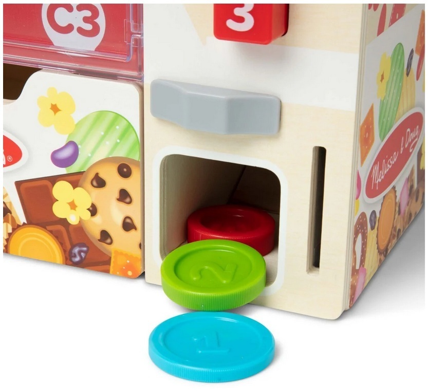 Sorteeri mängutoit, täida puidust müügiautomaadi riiulid, viska mängumünte masinasse, vali soovitud toode vastavat nuppu vajutades ja toode kukub riiulilt sahtlisse! Töötab nagu päris müügiautomaat!