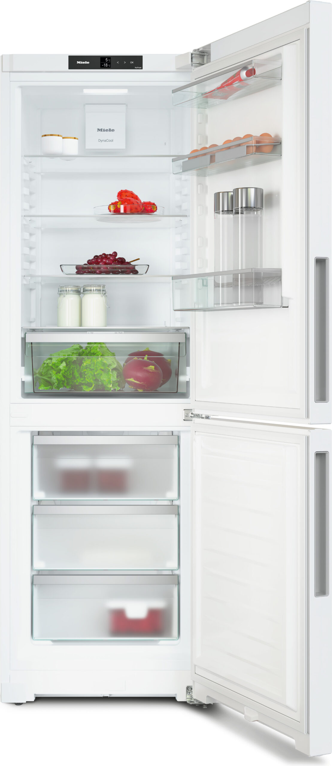 Kvaliteetne ja mahukas eraldiseisev külmik-sügavkülmik. Kaasaegne käepidemevaba disain võimaldab paigutamist erinevatesse köökidesse. Lihtsasti kasutatava ja selge SensorTouch puutetundliku juhtimise ja LCD-ekraaniga toimub temperatuuri täpne reguleerimine kraadide täpsusega mõlema sektsiooni jaoks eraldi. Äärmiselt vastupidavad ja mitmekülgsed reguleeritavad turvaklaasist riiulid ja vastupidavad ukseriiulid pakuvad mitmekülgseid hoiustamisvõimalusi. Tänu XL-sisemahule mahub külmkappi isegi Miele sisseehitatud ahjude küpsetusplaat. DynaCool-ventilaator ringleb külmkapi sees jahedat õhku, hoides kogu sisetemperatuuri konstantsena. See võimaldab teil toitu hoida külmkapi mis tahes osas, ilma et peaksite muretsema temperatuurierinevuste pärast. Puu- ja köögiviljade jaoks on külmkapis mahukas, niiskuskontrollitud DailyFresh värske sahtel, kus puu- ja köögivilju säilitatakse kuni kaks korda kauem kui traditsioonilises köögiviljasahtlis. Sügavkülmiku automaatne NoFrost sulatamine hoolitseb sulatamise eest teie eest. NoFrost-sügavkülmikus toimub külmutamine jaheda õhu abil, mis hoiab ära härmatise tekkimise külmutatud toidu pinnale. Tänu külmiku kiirjahutuse ja sügavkülmiku kiirkülmutusfunktsioonidele jahtub ja külmub toit väga kiiresti, parandades seeläbi selle säilivusaega.