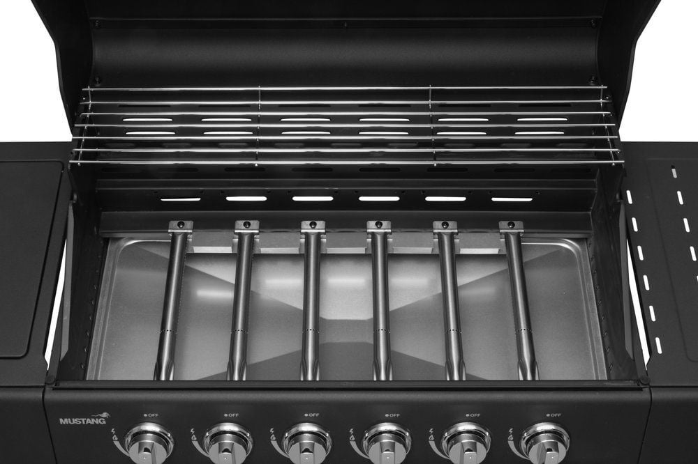 Mustang Kingsville 6+1 on tilava ja tehokas kuusipolttiminen kaasugrilli suurempaan grillaustarpeeseen. Kuusi 2,0 kW pääpoltinta ja 2,5 kW sivukeitin tuottavat yhteensä 14,5 kW tehon, mikä mahdollistaa yhtäaikaisen grillaamisen ja lisukkeiden valmistuksen. Ruostumattomasta teräksestä valmistetut polttimet varmistavat käyttövarmuuden ja pitkän käyttöiän.