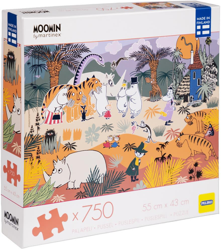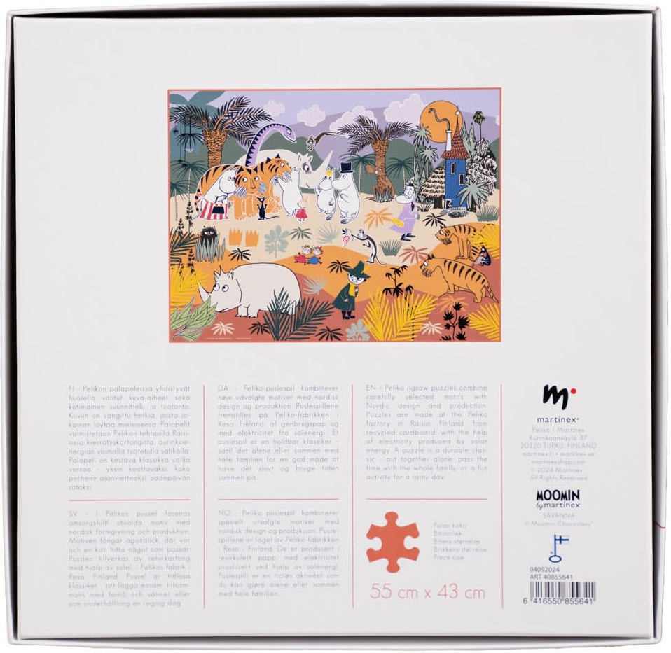 750-tükilises Savanni pusles seiklevad Muumid džunglis, mis on ootamatult Muumimaja ümber kasvanud. Valmis pusle mõõtmed on 55 x 43 cm ja see on valmistatud Soomes taaskasutatud papist.