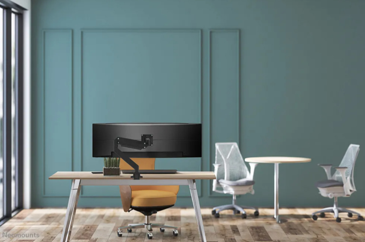 Neomounts NM-D775+ on mitmekülgne lauakinnitus, mis on varustatud reguleeritavate sätete ja kõrgusega reguleeritava gaasvedruga ühele 10″-49″ kumerale monitorile.