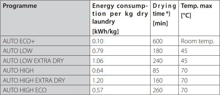 - 6 automaatprogrammi: ECO+, MADAL, MADAL EKSTRA KUIV, KÕRGE, KÕRGE EKSTRA KUIV, KÕRGE ECO