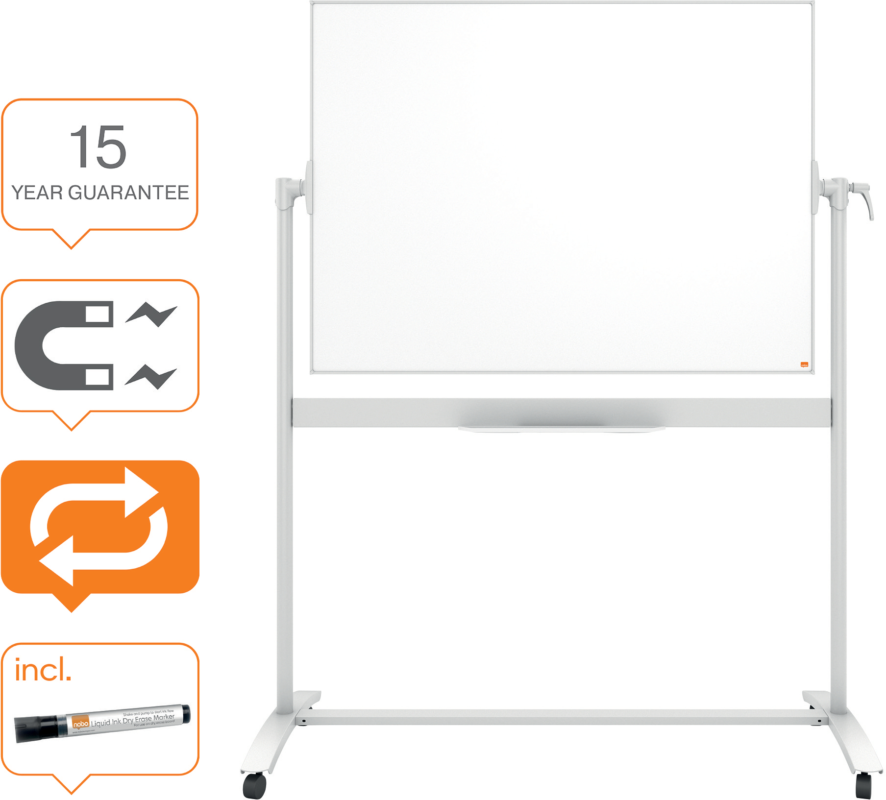 Mobile magneettinen valkotaulu nykyaikaisilla ja huomaamattomilla kehyksillä, jotka maksimoivat käyttöalan. Taulun alareunassa tilava kynäteline, joka ei vähennä käyttöalaa. Varustettu pyörillä, jotka helpottavat taulun siirtämistä kokous- ja taukotilojen välillä. Magneettinen teräspinta parantaa pyyhittävyyttä, kohtalaiseen käyttöön.