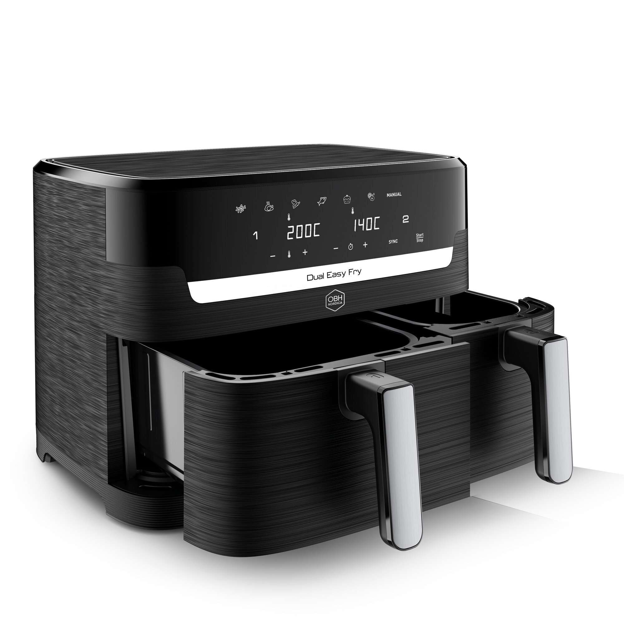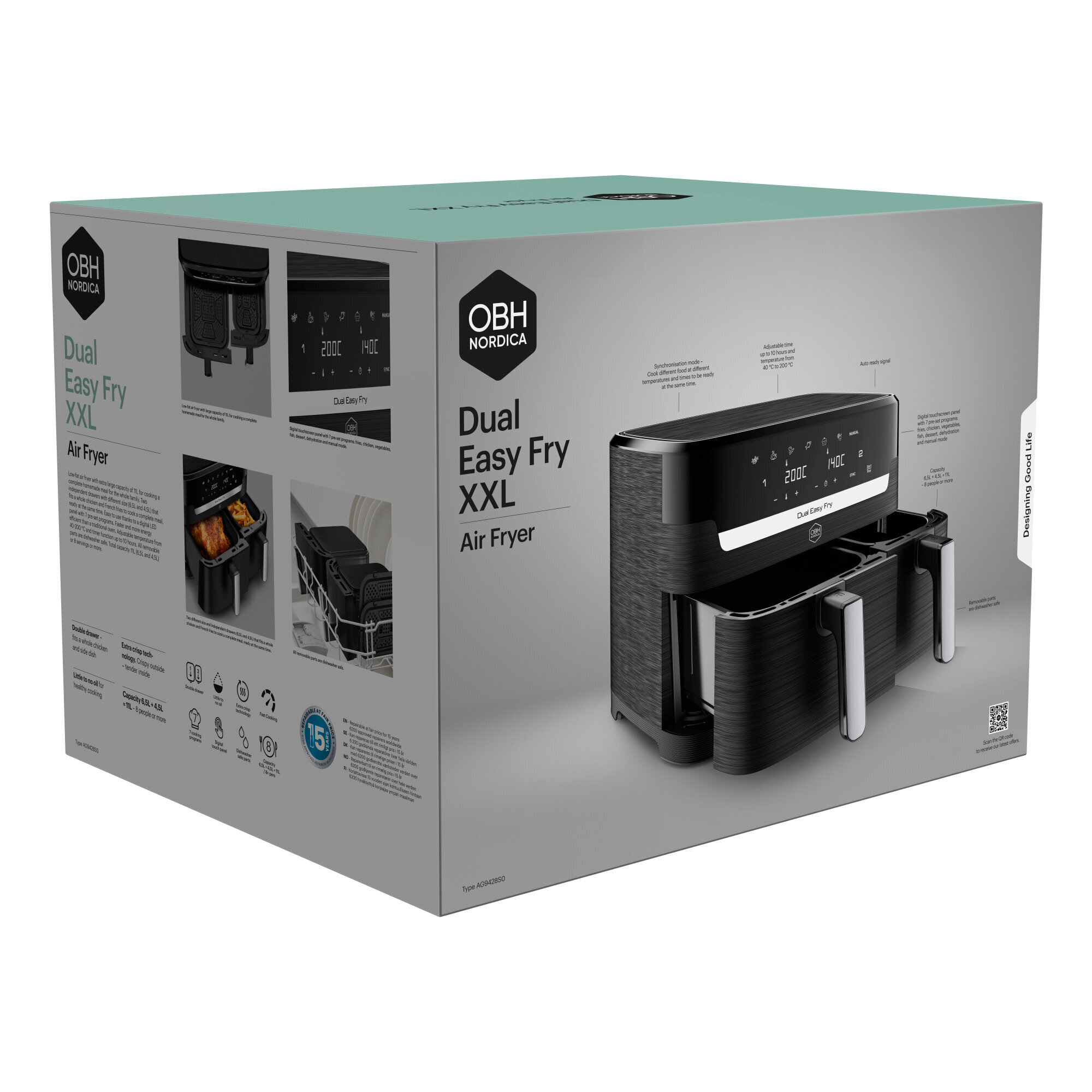 Yhteensä 11 litran tilavuus (6,5 l + 4,5 l) mahdollistaa suurten annosten valmistamisen kerralla. Tämä tekee OBH Nordica Dual Easy Fry XXL -airfryerista täydellisen valinnan perheille tai silloin, kun haluat valmistaa ruokaa useammalle vieraalle.