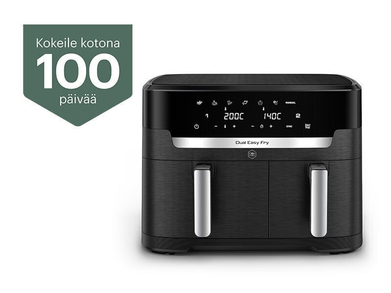 Dual Easy Fry XXL -airfryerissa on kaksi toisistaan riippumatonta kypsennysastiaa, joiden avulla voit valmistaa esimerkiksi broilerin ja perunat eri lämpötiloissa. Synkronointitoiminto huolehtii siitä, että molemmat ruoat valmistuvat yhtä aikaa, mikä tekee arjen ruokailuista sujuvampia ja juhlahetkistä stressittömämpiä.