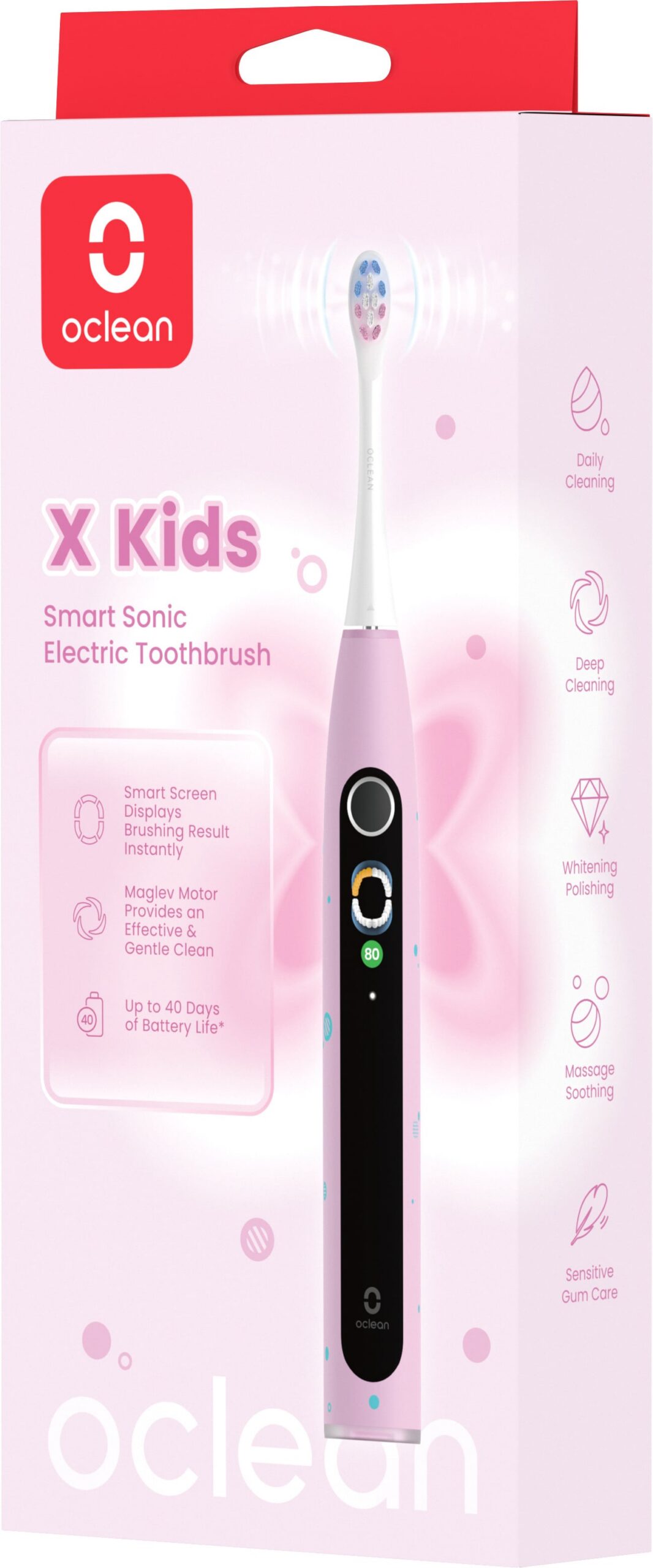 Oclean X Kids on loodud selleks, et muuta hammaste pesemine lastele ja teismelistele lõbusaks ja harivamaks. See nutikas helihambahari ühendab endas võimsa puhastuse, õrnuse ja interaktiivse tagasiside, et aidata lastel kujundada tervislikke suuhügieeniharjumusi. Ekraan muudab harjamise mänguks, kus punktide ja tsoonide jälgimine motiveerib sind häid harjamisharjumusi jätkama.
