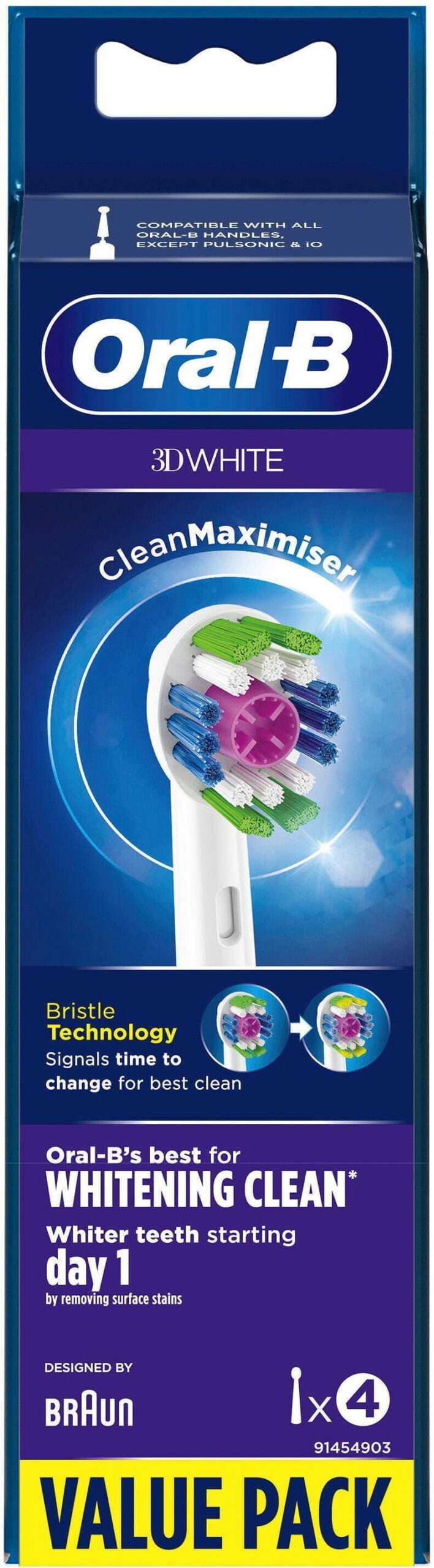 3D White on osa Oral-B esmaklassilistest asendusharjadest ja selle eksklusiivne poleerimiskorv valgendab hambaid esimesest päevast alates, eemaldades pinnaplekid. Oral-B täiustatud 3D White asendusharjadel on CleanMaximiser tehnoloogia, mis muudab harjaste värvi rohelisest kollaseks, kui on aeg asendushari välja vahetada. Unikaalsed harjased pühivad hambakattu minema, pakkudes paremat puhtust kui tavaline manuaalne hambahari.