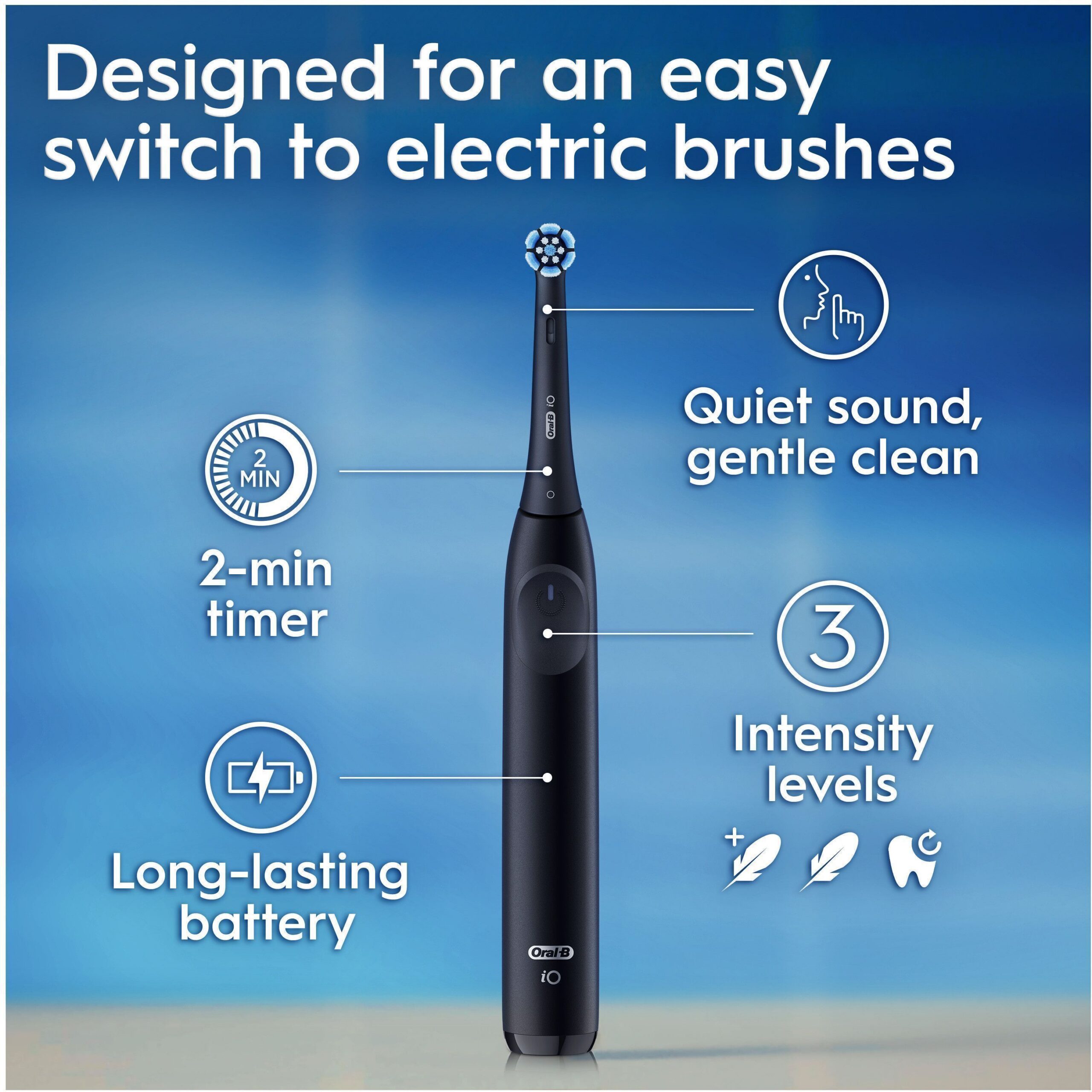 Oral-B iO 2 on väga hõlpsasti kasutatav elektriline hambahari. Sellel on ainult üks nupp, vaikne heli ja pikk aku tööiga. Sobiva harjamisvõimsuse saad valida kolme erineva intensiivsuse hulgast: eriti õrn, õrn ja igapäevane puhastus. Kaheminutiline taimer ja iga 30 sekundi järel kostuv piiks annavad märku, et peaksite hambaid pesema hambaarstide soovitatud aja jooksul ja harjamisala sobivate intervallidega vahetama.