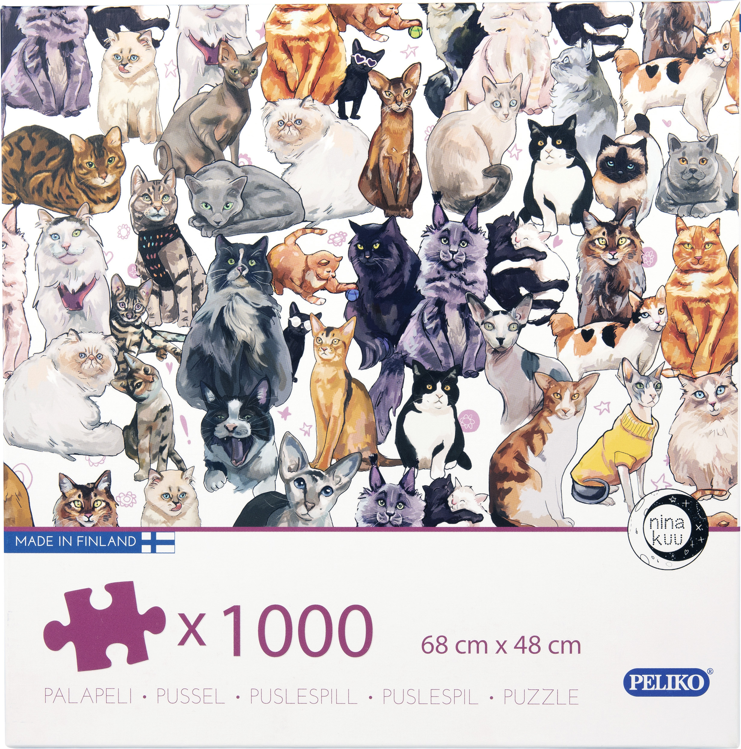 Kunstnik Nina Kuu joonistatud kasside pilt 1000-tükilise pusle kujul. Kas leiad pildilt oma lemmikkassi? Valmis pusle suurus on 68 x 48 cm.