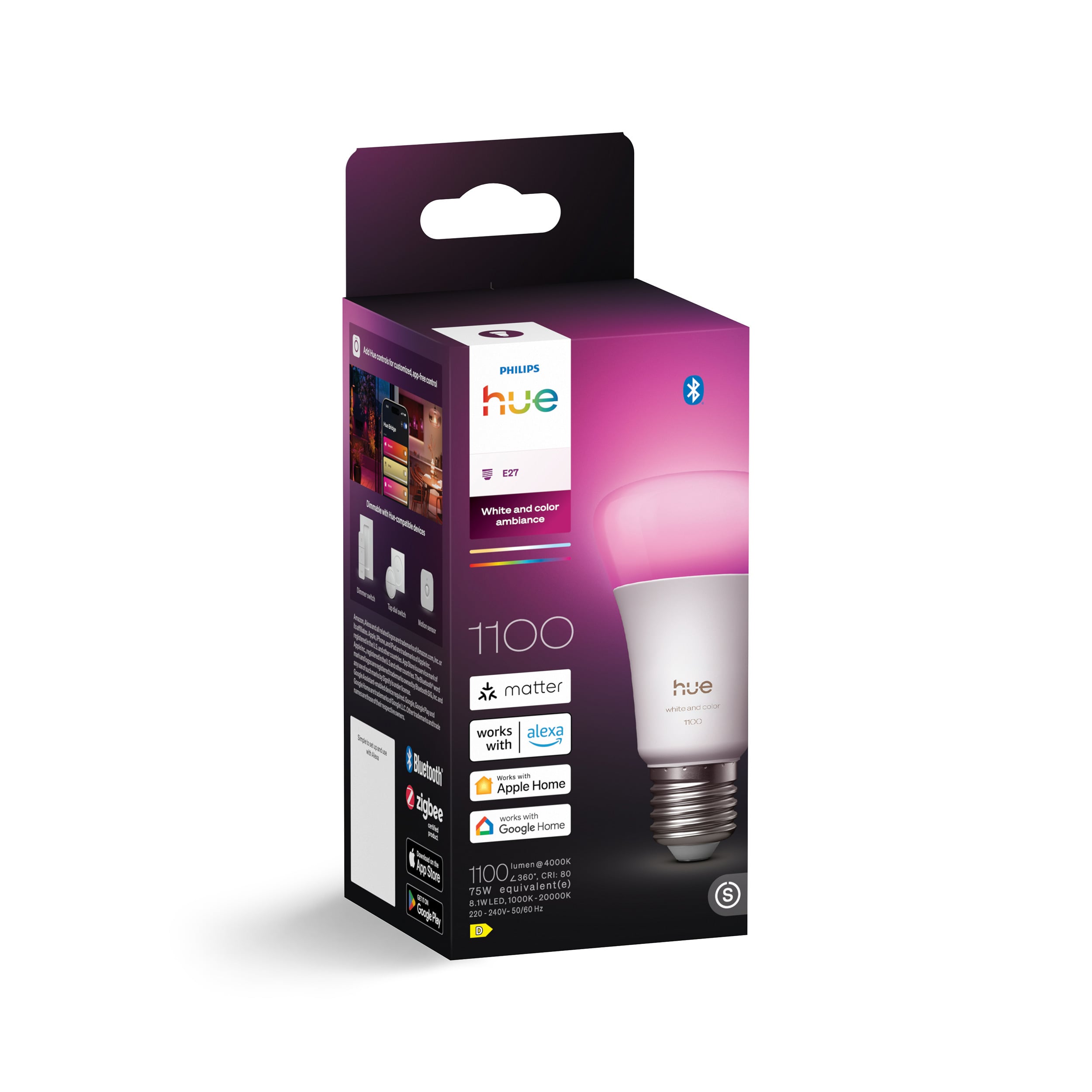 See Philipsi Hue valge ja värviline meeleoluvalgusti A60 nutikal pirnil on E27 sokkel. Valge ja värvilise meeleoluga pirn suudab taasesitada muljetavaldavat valikut valge valguse varjundeid. Seda saab ka hämardada 0,2% heleduseni. Lisaks miljonite küllastunud värvitoonide taasesitamisele on pirnil ka Chromasynci tehnoloogia, mis tähendab, et iga Hue pirn taastoodab täpselt sama värvi.