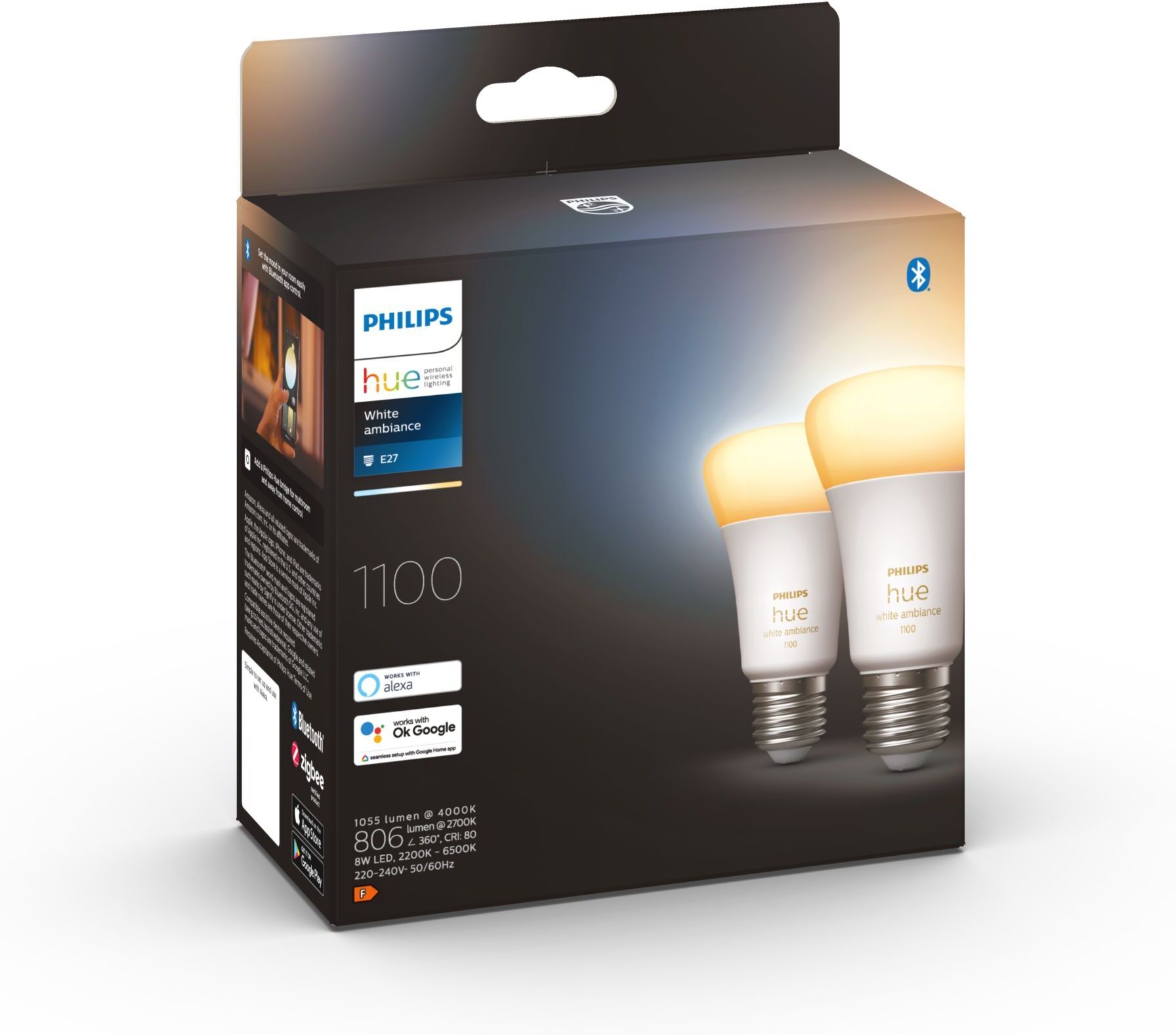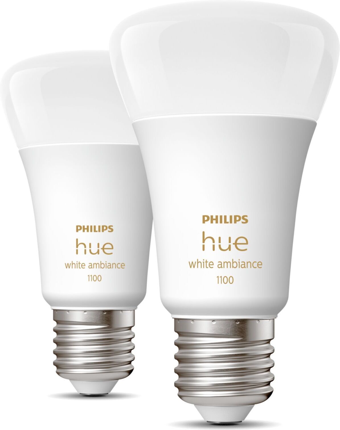 See pakk sisaldab kahte 8 W Philips Hue White Ambiance LED-pirni E27 sokliga. Pirni võimsus on samaväärne 75 W hõõglambiga, mille valgusvärv on 4000 K. Pirni valgusvoogu saab hämardada ja värvitemperatuuri saab reguleerida külma ja sooja valge vahel. Philips Hue viib nutika kodu integratsiooni uuele tasemele. See terviklik ökosüsteem võimaldab teil kasutada nutikat valgustust igas teie kodu toas. Hue aitab teil hommikul värskena ärgata ja õhtul lõõgastununa magama minna.