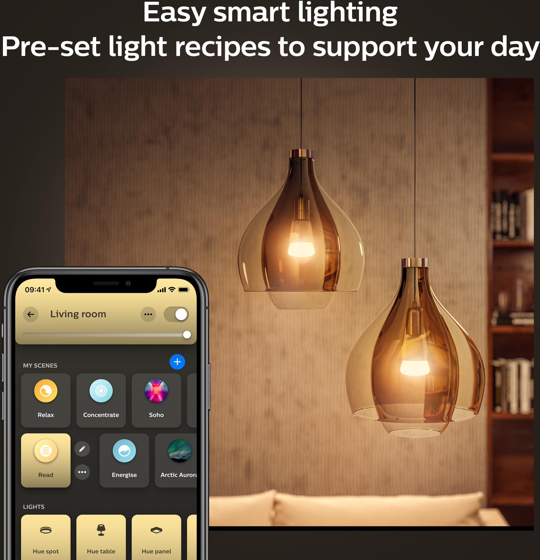 - Neli valmis valgustusseadistust muudavad teie igapäevaelu lihtsamaks, kuna need on spetsiaalselt loodud igapäevast rutiini silmas pidades: energiat andmine, keskendumine, lugemine ja lõõgastumine. Üks jahe valge seadistus toetab energiat andmist ja teine keskendumist, seega aitavad need teil päeva alustada ja keskendumisvõimet säilitada. Soojad seadistused lugemiseks ja lõõgastumiseks seevastu võimaldavad teil sukelduda heasse raamatusse ja lasta oma meelel puhata.