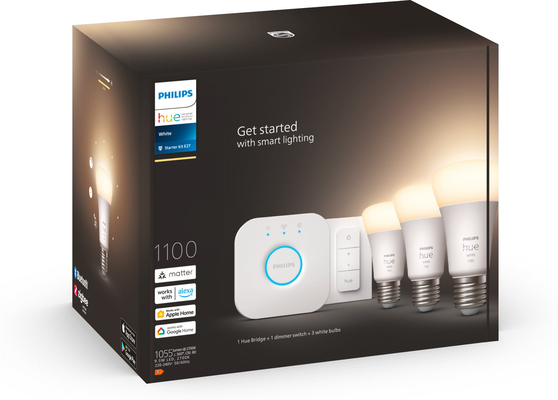 Hue White’i stardikomplekt sisaldab kolme E27-sokliga Hue lampi, Hue süsteemi kaugjuhtimiseks vajalikku valgusvõrgu ruuterit ja juhtmevaba hämarduslülitit.