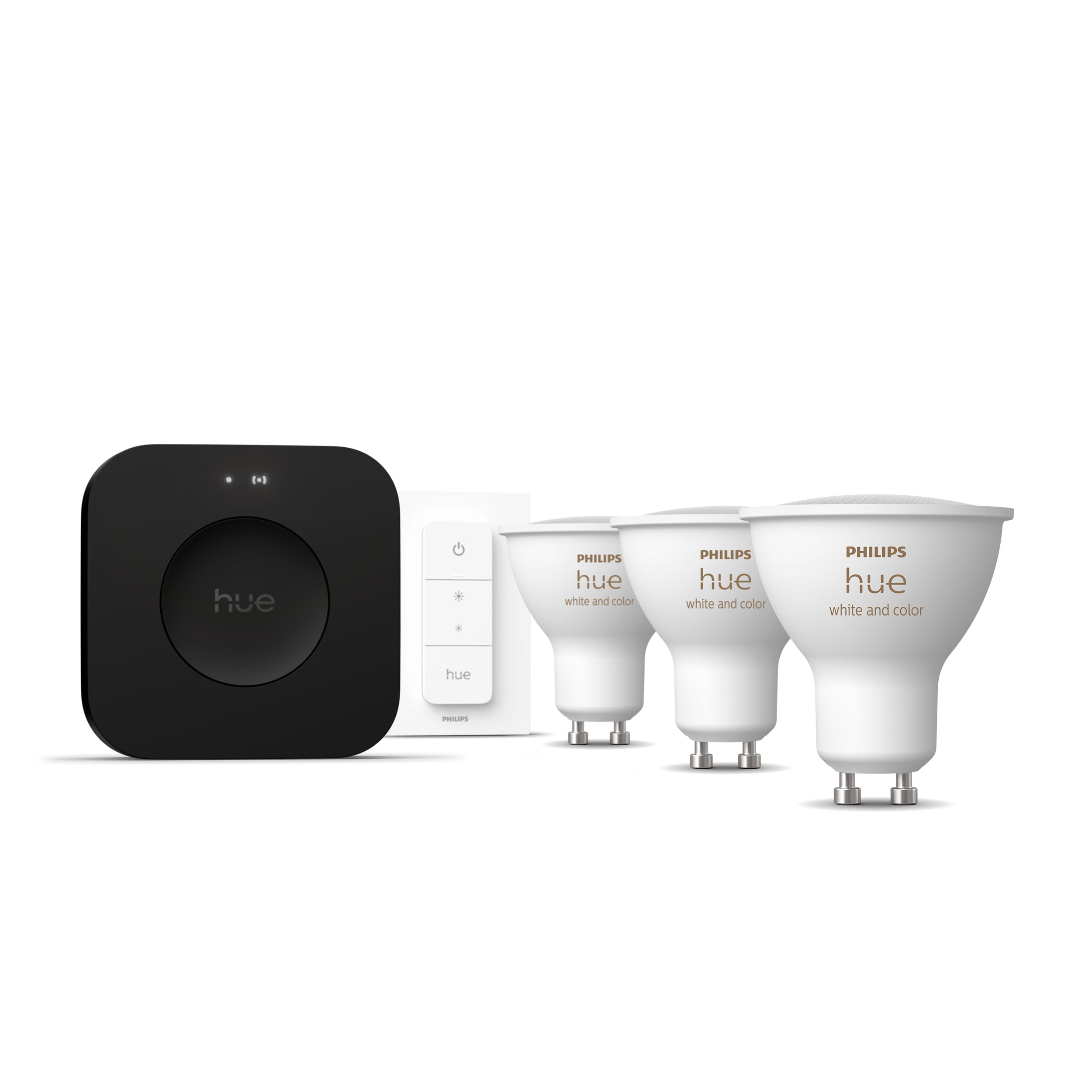 See Philipsi Hue valge ja värvilise meeleoluvalgustuse stardikomplekt sisaldab kolme GU10 nutikat pirni, Bridge Pro’d ja dimmerlülitit. Valged ja värvilised meeleoluvalgustid suudavad taasesitada muljetavaldavat valikut valge valguse toone ja küllastunud värve. Tänu integreeritud Chromasynci tehnoloogiale taastoodavad kõik pirnid täpselt sama tooni. Valgust saab ka hämardada väga madalale 0,2% heledusele.