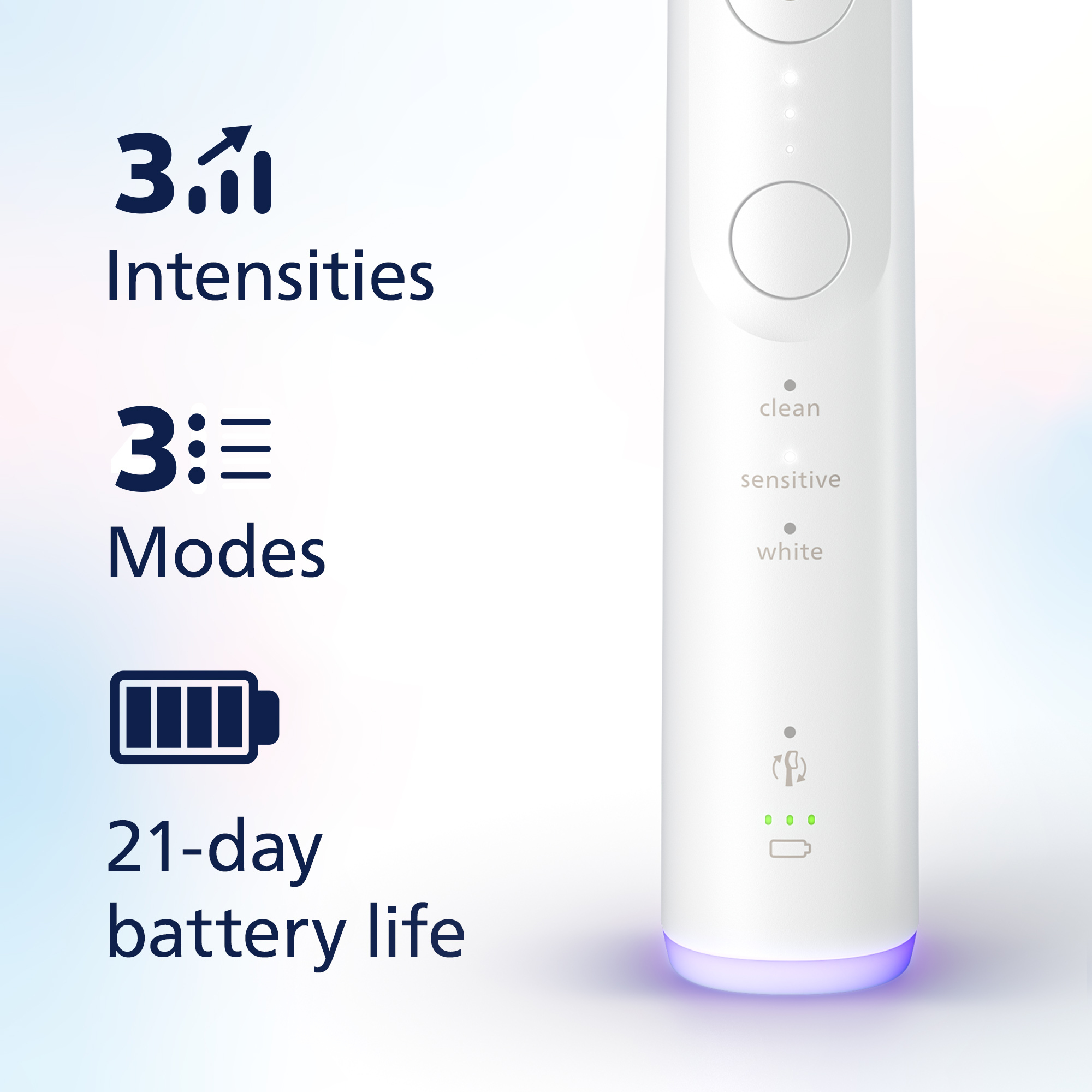 - Ideaalne tundlikele hammastele ja igemetele. Vali 9 seadistuse vahel: 3 harjamisrežiimi (puhas, tundlik või valge) ja 3 võimsusseadistust (madal, keskmine, kõrge).