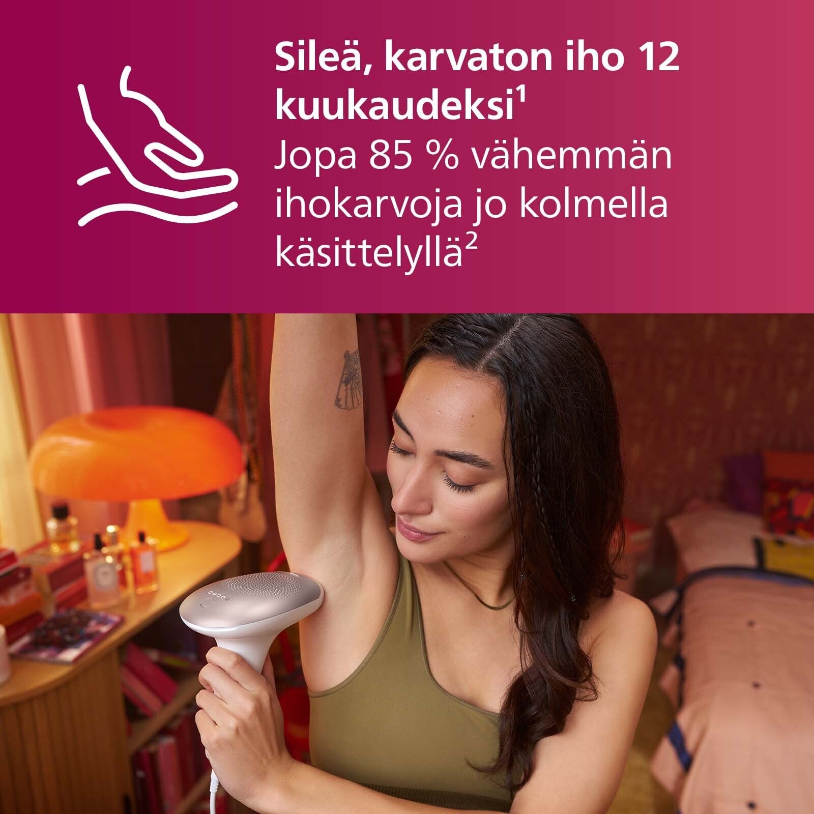 Philips Lumea saadab õrnu valgusimpulsse karvajuurtele. See vähendab järk-järgult kehakarvade kasvu. Kui kordate protseduuri, jääb teie nahk kaunilt sile ja pehme.
