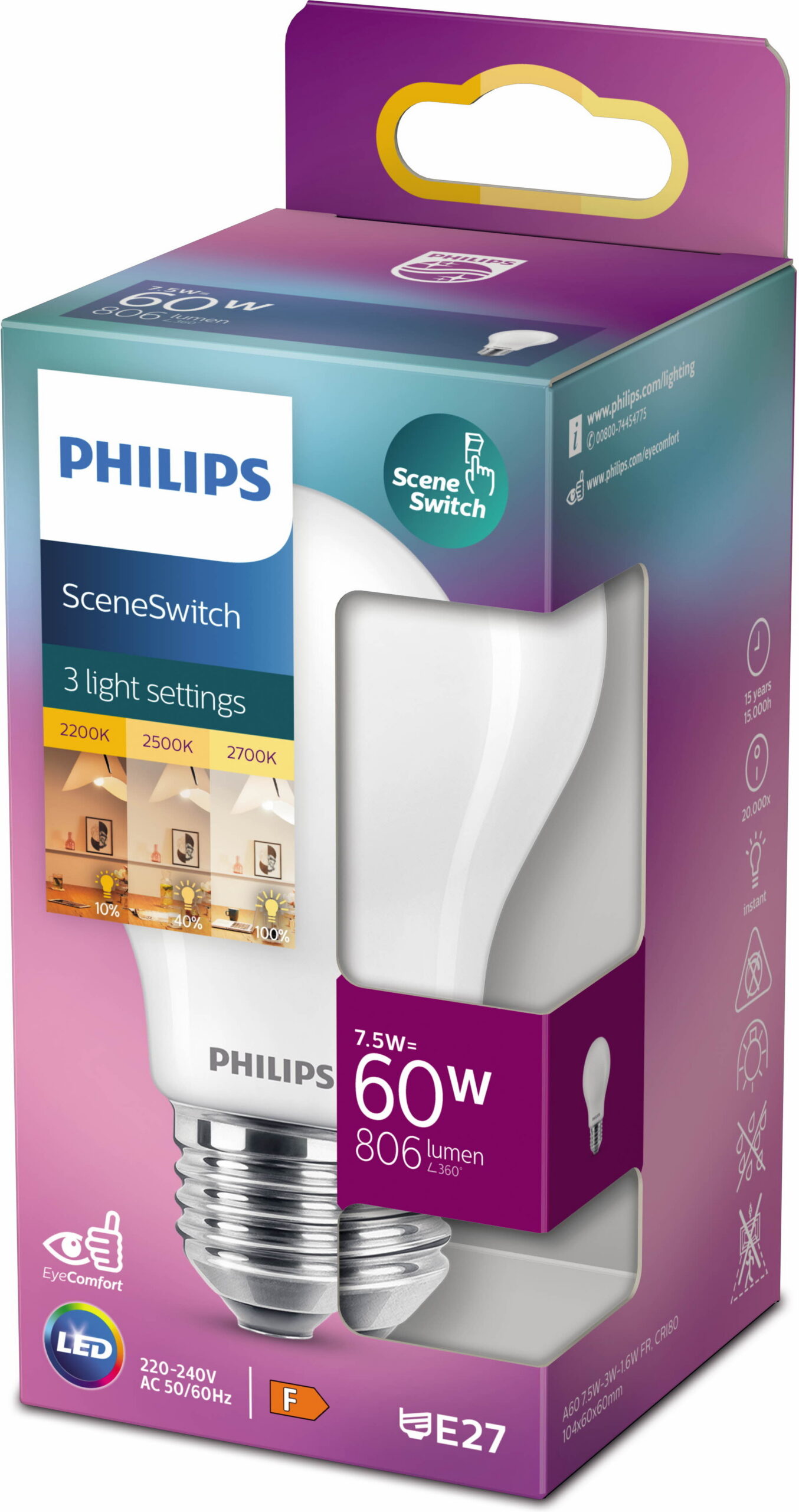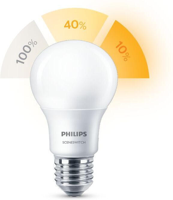 SceneSwitch on lamp sulle, kes soovid kõige lihtsamat võimalikku hämarduslahendust ilma installimise ja tarkvarata – see muudab valgustuse lihtsaks ja täiuslikuks! SceneSwitchi lampidega saad hõlpsalt lülituda praktiliselt valgustuselt hubasele soojatoonilisele valgusele. Pole vaja eraldi rakendusi alla laadida, see töötab valguslülitist! Valitavad valgustugevuse sätted on: 8 W (2700 K), 5 W (2500 K) ja 2 W (2200 K). Hämardit ega täiendavaid paigaldusi pole vaja. SceneSwitchi lampidel on mälukiip, mis mäletab sinu viimast valgusseadistust!