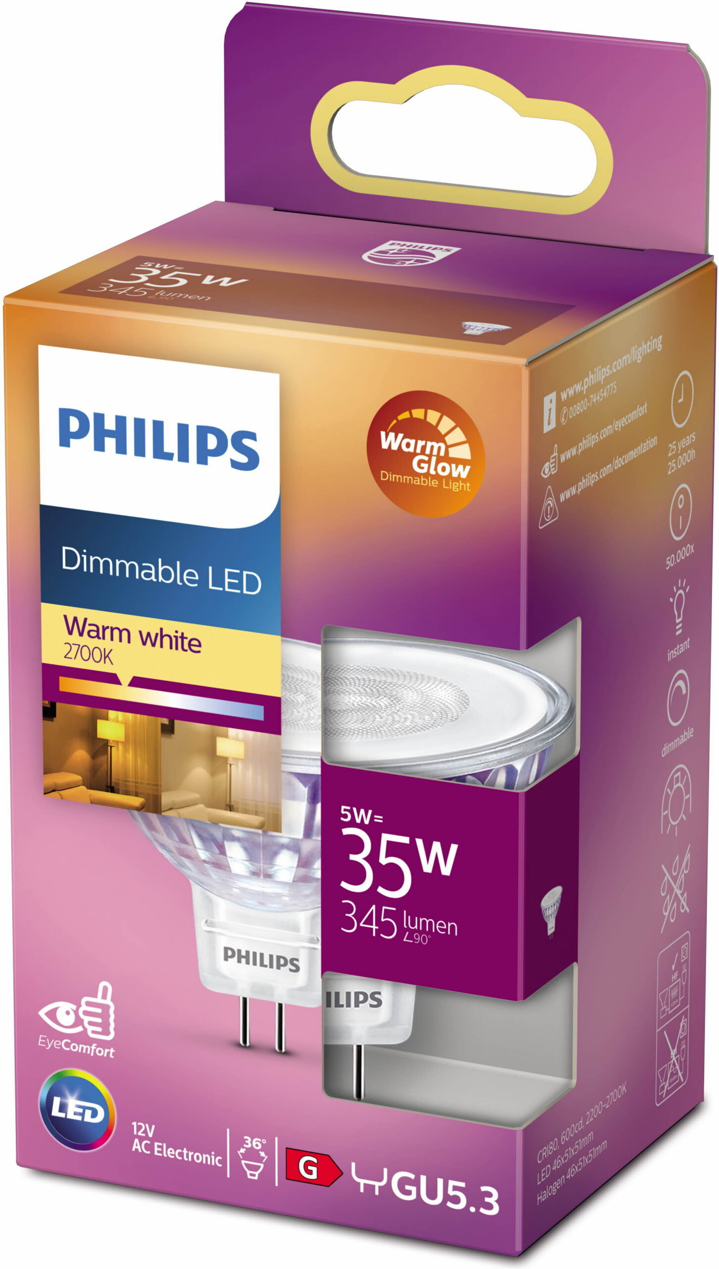 Philips Warm Glow LED MR16 kohtvalgusti, 12V, GU5.3, 2200-2700K, 345 lm