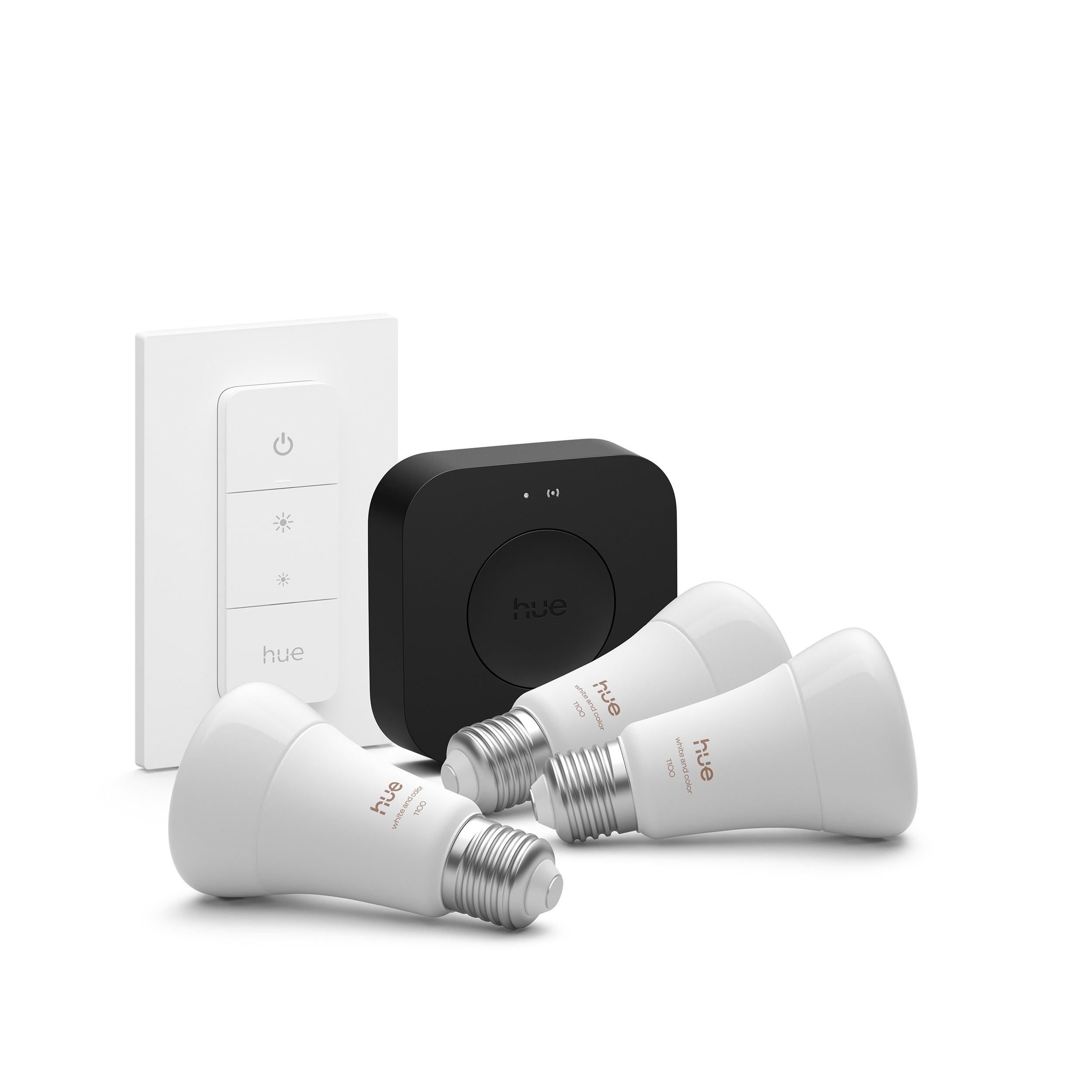 See Philipsi Hue valge ja värvilise meeleoluvalguse stardikomplekt sisaldab kolme A60 nutikat pirni E27 sokliga, samuti Bridge Pro ja dimmerlülitit.
