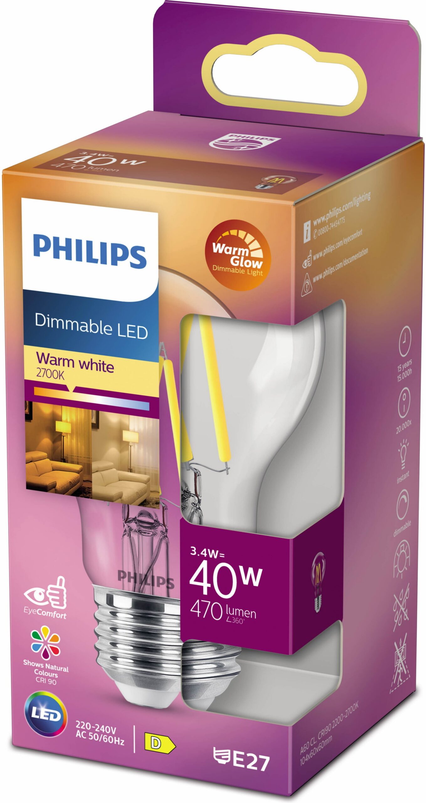 Philipsi WarmGlow LED-lamp pakub kaunist ja sooja valgust, erakordselt pikka kasutusiga ning kohest ja märkimisväärset energiasäästu. Selles Warm Glow lambis ühendab läbipaistev klaasist kuppel kaunilt traditsioonilise lambi välimuse uusima tehnoloogiaga. Puhas ja elegantselt disainitud lamp on ideaalne asendus traditsioonilistele lampidele. Philipsi Warm Glow seeria lambid loovad kauni sooja tooniga valgustuse ja neid saab hämardada traditsiooniliste pirnide soojadele värvidele, lambi värvitoon muutub soojemaks, mida rohkem te seda hämardate. Saate valgustustaset vastavalt oma soovile reguleerida ja luua olukorrale sobiva atmosfääri. See sobib kasutamiseks enamiku dimmeritega.