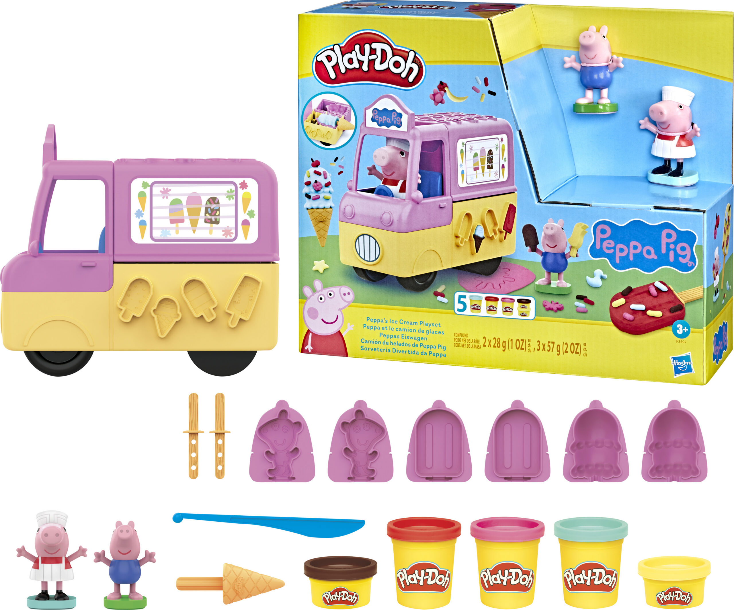 PLAY-DOH Peppa Pig mängukomplektiga saate teha jäätist ja pulgakommi ning neid kaunistada. Komplektis on: Peppa Pig figuur, Jerry figuur, jäätiseauto, 2 pulgakommipulka, sprinklerid, jäätisetuutu, 3 purki modelleerimissavi.