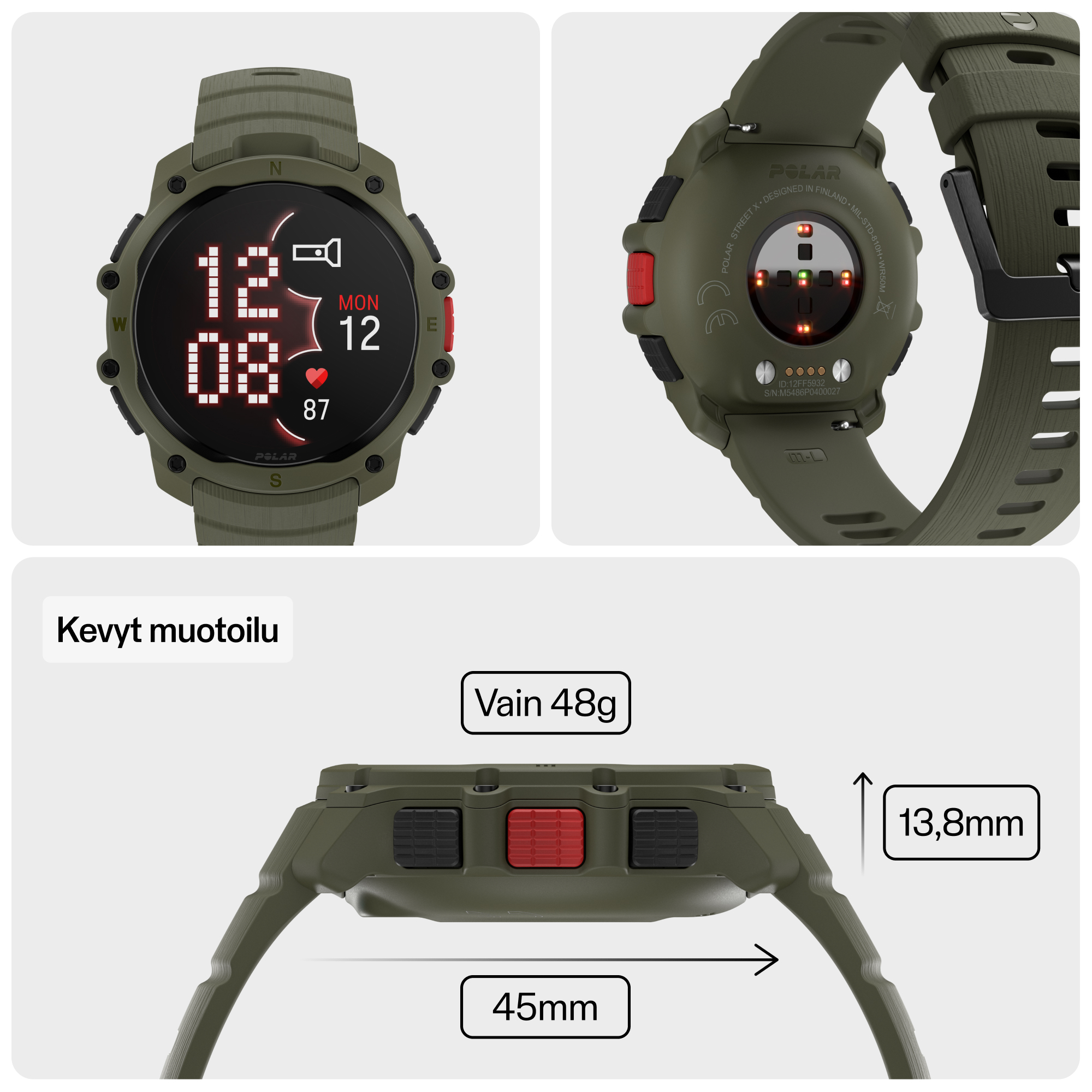 Polar Street X on kerge ja vastupidav linnalik spordikell, mis sobib ideaalselt neile, kes elavad linnas ja treenivad mitmel moel. Selle ere 1,28-tolline AMOLED puutetundlik ekraan Gorilla Glass 3-ga on hõlpsasti loetav igasugustes valgustingimustes. Kell annab täpset sooritusinfot tänu Precision Prime™ optilisele pulsisageduse mõõtmisele ning sisaldab sisseehitatud GPS-i, baromeetrit ja marsruudijuhiseid, mis toetavad liikumist linnatänavatel ja mitmekesisel maastikul. Lisaks aitab valge ja punase valgusega LED-taskulamp näha hämaras ja pakub vajadusel märkamatut valgust. Vastupidav, sõjaväeklassi põrutuskindel konstruktsioon tagab, et kell peab vastu igapäevaelu väljakutsetele.
