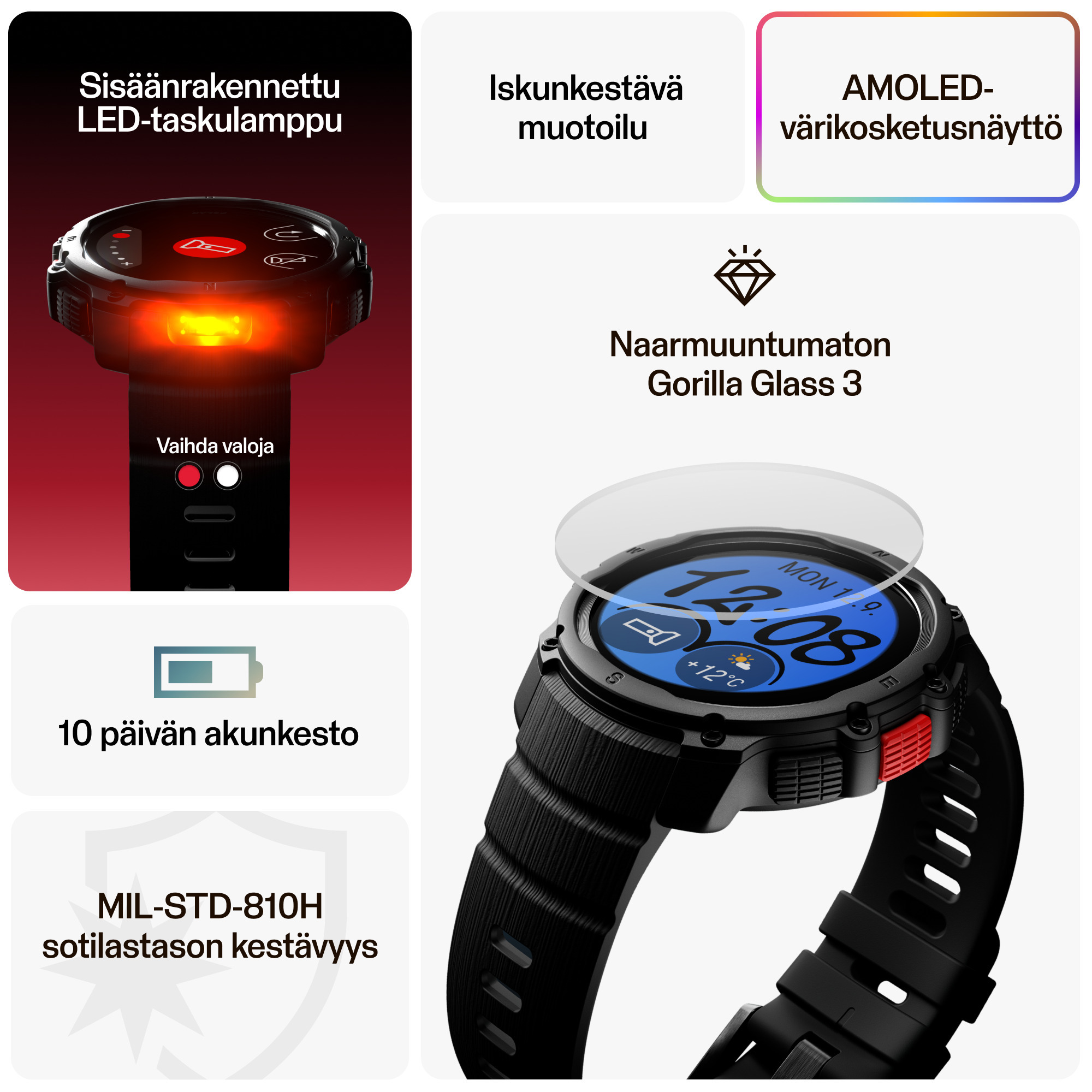 Kellal on nutikella funktsioonid, mis muudavad teie elu lihtsamaks, näiteks telefoniteavitused, muusika juhtimine, mitu äratust ja ilmateated. Saate ekraani ja liidest kohandada, valides erinevate kella sihverplaatide, värviteemade ja vidinate hulgast, muutes kõige olulisema teabe hõlpsasti kättesaadavaks.