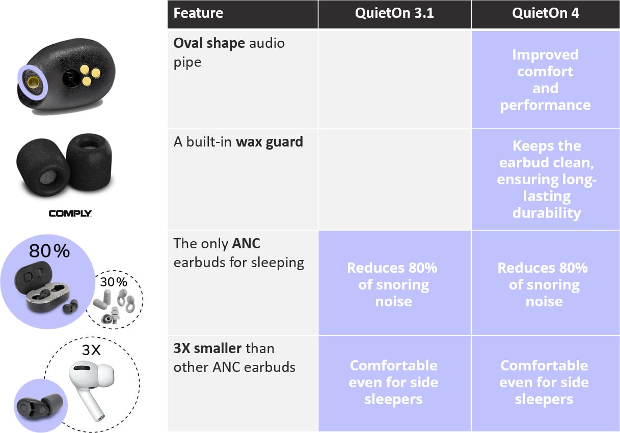 QuietOn 4 on ainulaadsed kõrvatropid, mis ühendavad aktiivse ja passiivse mürasummutuse, et blokeerida öist müra, alates norskamisest partnerist kuni liiklusmüra ja naabri peoni. Aktiivne mürasummutus blokeerib tõhusalt müra kogu sagedusalas, kuid eriti blokeerib madalaid helisid, mida tavalised kõrvatropid ei suuda. Kvaliteetsed Comply kõrvaotsad tagavad suurepärase mugavuse, sobivuse ja passiivse mürasummutuse rahulikuks uneks. Ei mingit maskeerivat müra, Bluetoothi ega elektromagnetilist kiirgust. Tänu üliväikesele suurusele ja kõrva loomulikku kuju järgivale disainile sobivad QuietOn 4 ka külili magajatele.