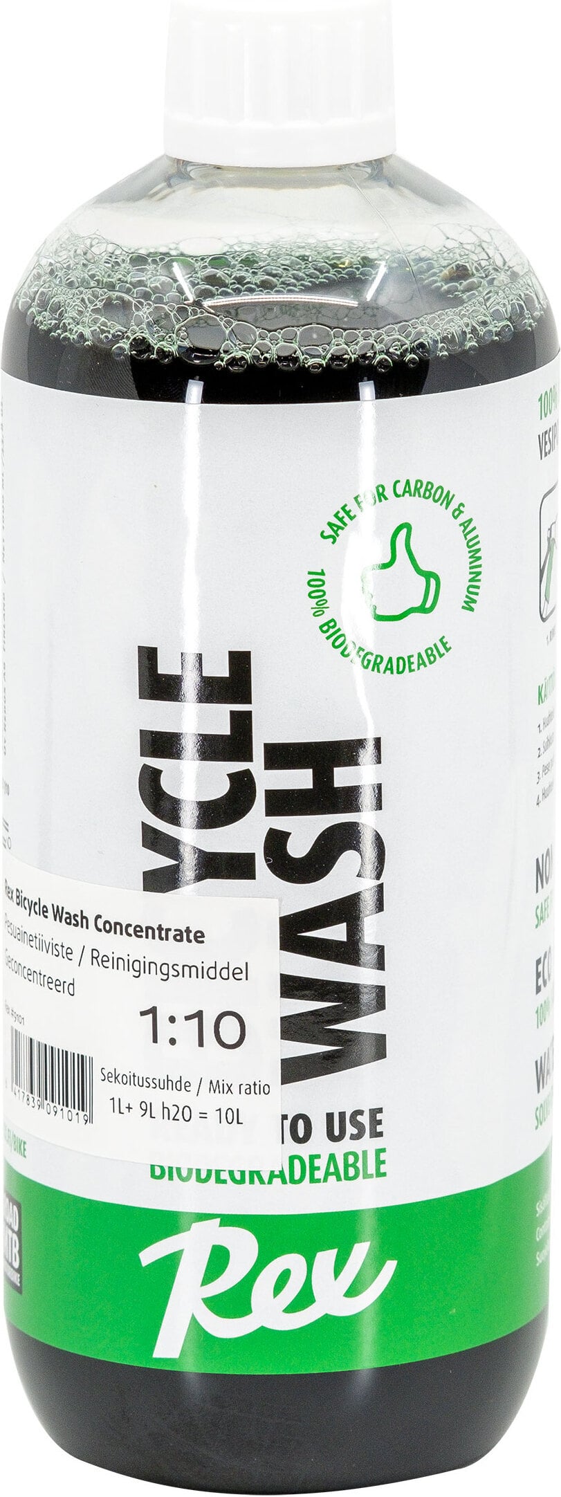 1000ml REX Bicycle Wash -tiivisteestä saa yhteensä 10 litraa valmista pesuainetta. Rex Bicycle Wash koostuu sataprosenttisesti biohajoavista raaka-aineista. Voimakkaasti emäksiset pesuaineet aiheuttavat korroosiota alumiiniosissa ja vievät anodisoitujen osien kiillon. Rex Bicycle Wash on todettu pitkissä liuotustesteissä täysin turvalliseksi. Rexin pyöräpesuaine ei myöskään jätä jarrulevyihin jarrutustehoa heikentävää pintaa kuten vahaa sisältävät pesuaineet. Valmistus perustuu moderniin ympäristöystävälliseen kemiaan, ilman liuottimia. Bicycle Washin seossuhteeksi on valittu tarpeeksi vahva, joten sillä onnistuu yleispesun lisäksi myös pinttyneen lian puhdistamiseen voimansiirrosta.