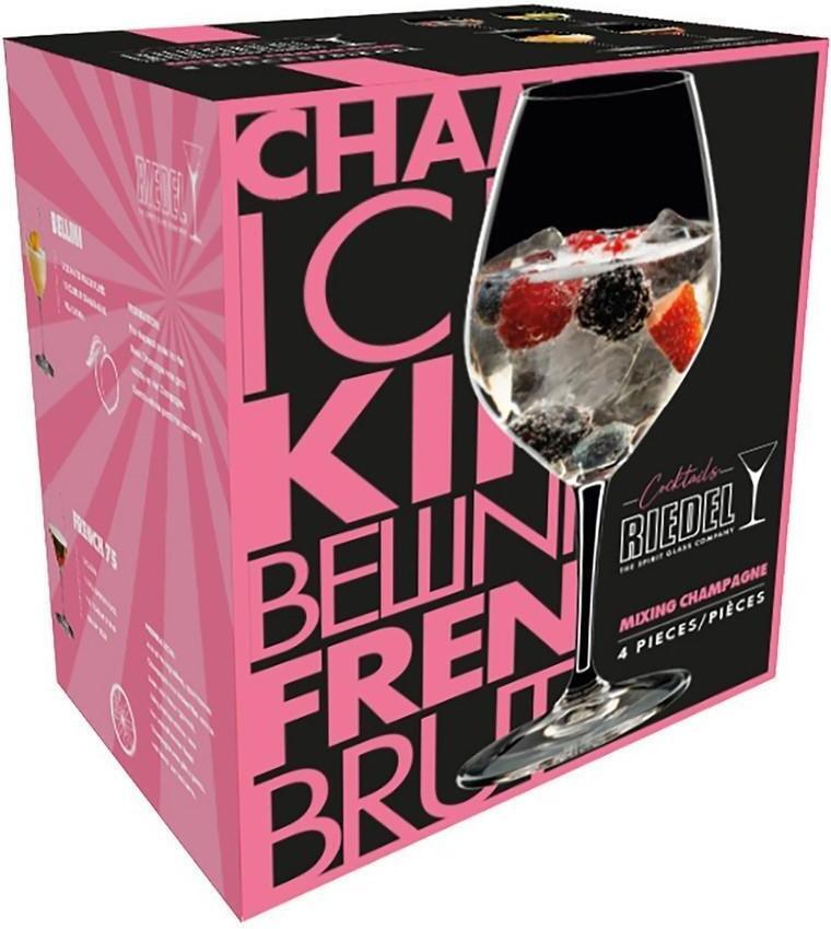 Täydelliset lasit kotibaarimestarille! Riedel Mixing Champagne -setti on osa uutta Mixing -settien sarjaa. Tämä setti sisältää neljä lasia, jotka ovat täydelliset erilaisille samppanja-pohjaisille juomille. Lasin pohjassa on pieni hionta, joka saa kuplat nousemaan kauniissa ketjussa juoman pintaan. Setti sisältää myös cocktailreseptejä, jotka on suunnitellut saksalainen baarimestari Mieke Zimmerman.