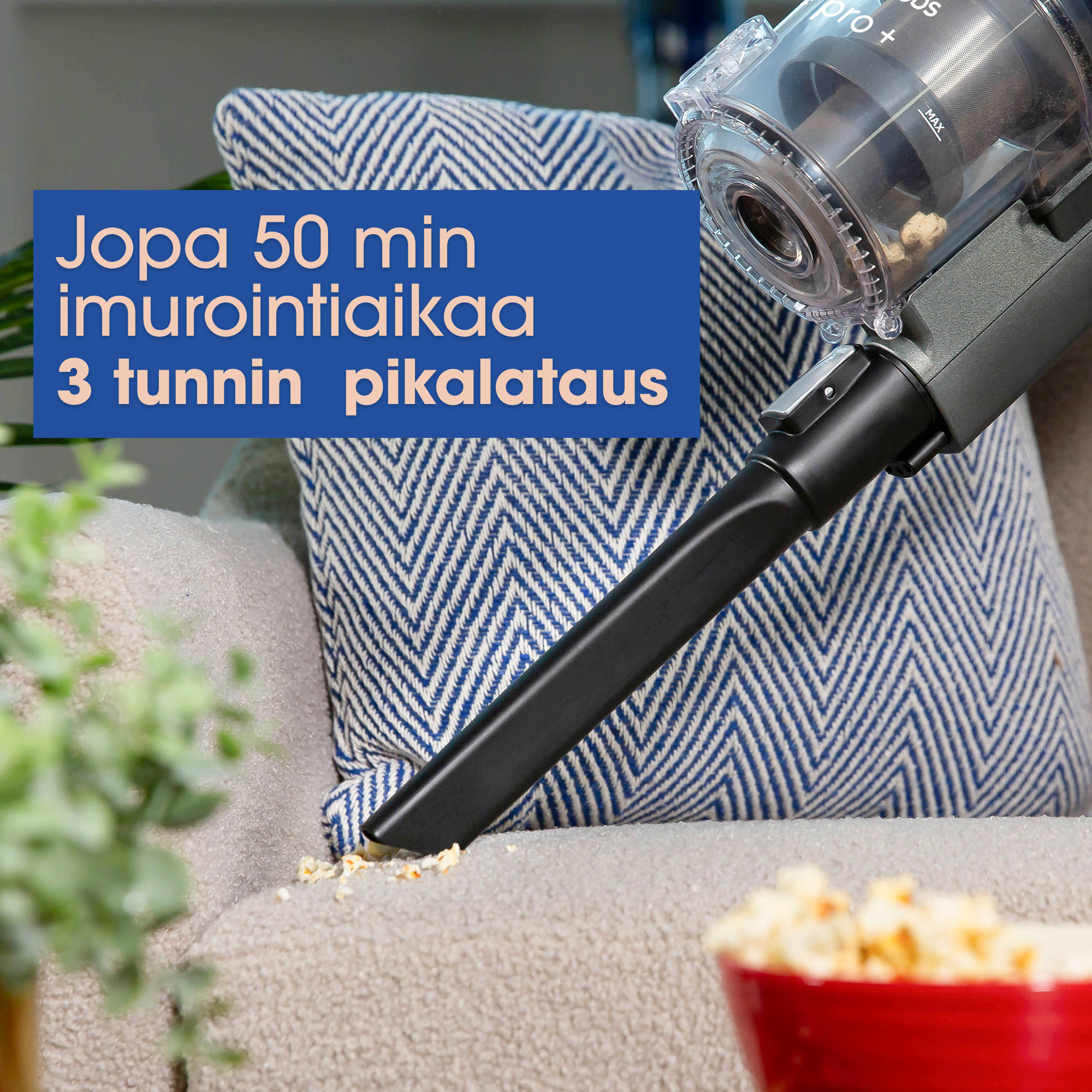 Aku laetakse täielikult kolme tunniga, mille järel on tolmuimeja kasutusvalmis kuni 50 minutit. Tavaliselt piisab sellest kogu kodu ühe laadimisega puhastamiseks.