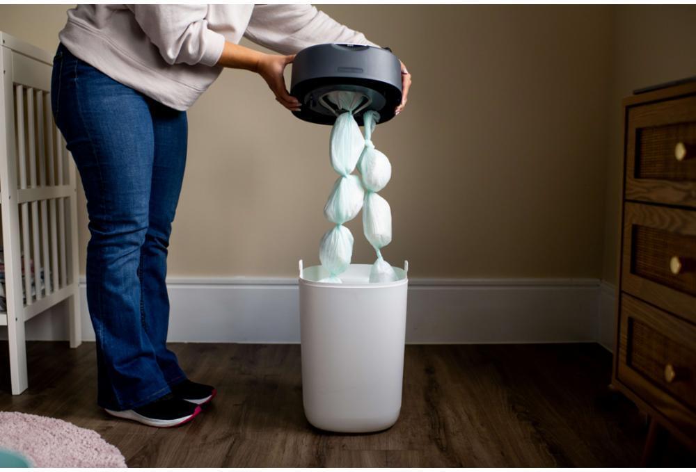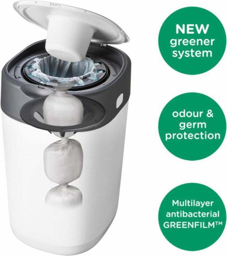 Sangenic Twist & Click mähkmekott mähib iga mähkme lõhna blokeerivasse ja baktereid hävitavasse rohekilesse. Ökoloogiline Greenfilm kile on biopõhine ja valmistatud roosuhkrust. Ka filmi etteandekassett ise on loodud jätkusuutlikkust silmas pidades, kuna selles kasutatav plast on 98% ulatuses taaskasutatud. Sa lihtsalt avad kaane, viskad mähkme prügikasti ja keerad käepidet 360 kraadi. Mähe on nüüd pakitud suletud kotti ja saate lihtsalt kaane sulgeda. Kaane siseküljel olev väljaulatuv osa lükkab voodri alati sügavale prügikasti. Seade pakib enne tühjendamist kokku umbes 28 mähkmeid.