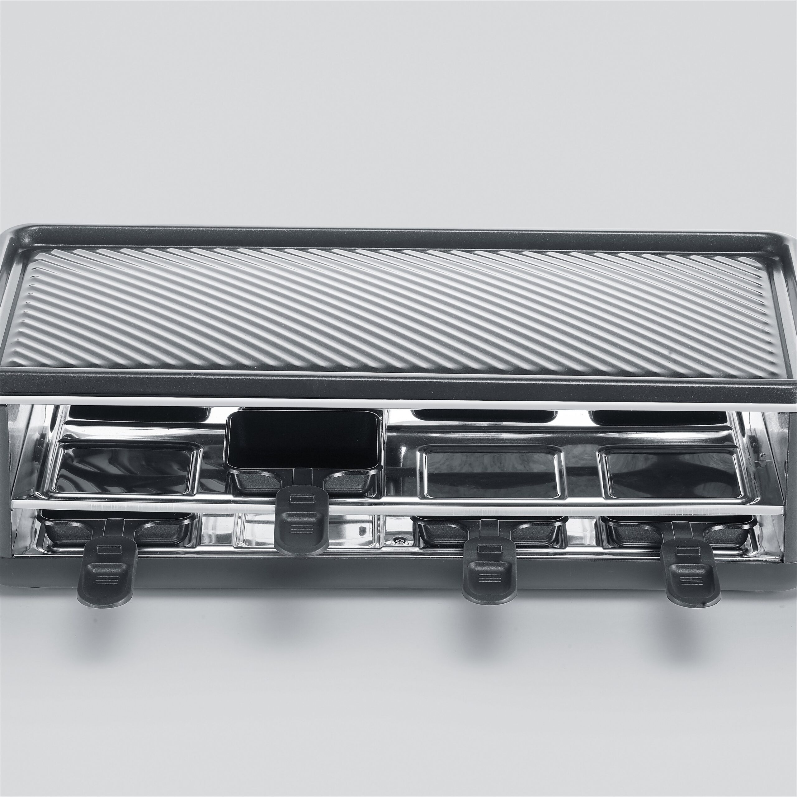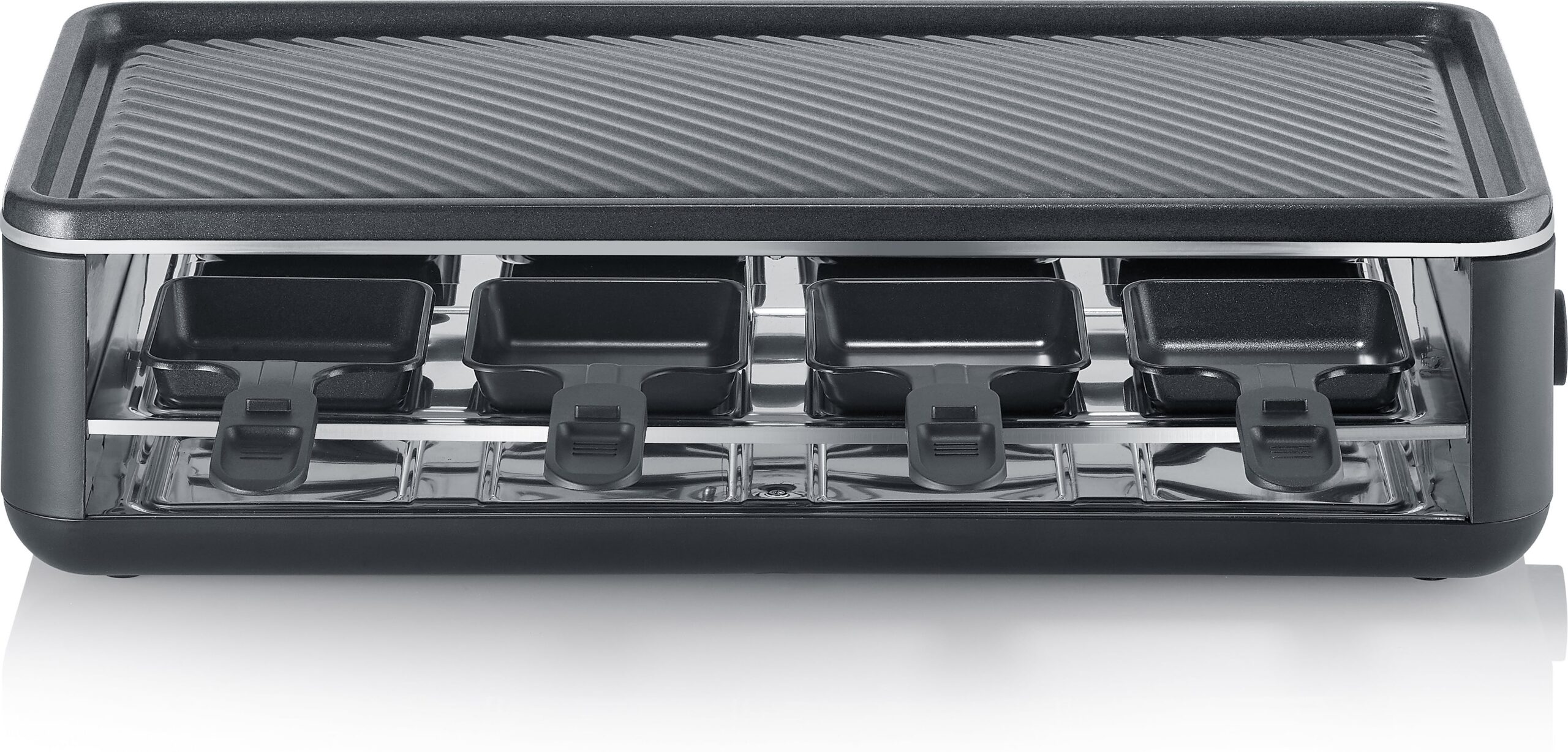 Tämä raclettegrilli on varustettu kahdeksalla raclette-pannulla, jotka sijaitsevat laitteen alaosassa. Jokaiselle ruokailijalle on oma pannu, joten voit nauttia raclettesta useamman henkilön kanssa samanaikaisesti. Raclette-pannuja voi käyttää juuston sulattamiseen ja pienten lisukkeiden valmistamiseen. Tämä tekee Severin RG2365 -mallista täydellisen ratkaisun seurueille ja illanviettoihin, joissa ruokailijat voivat valmistaa annoksiaan yhdessä ja jakaa erilaisia makuelämyksiä.