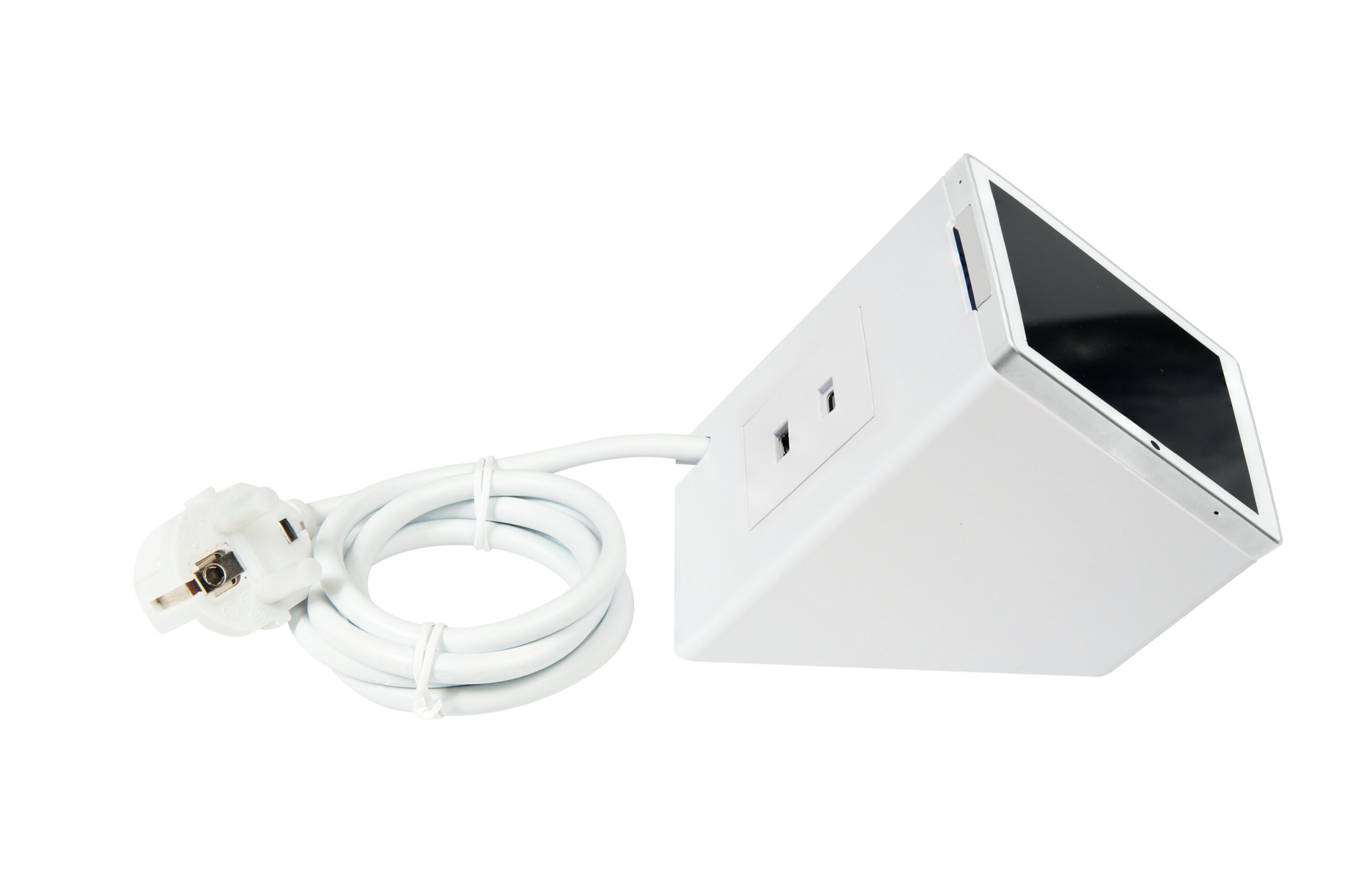 Laturi kiinnitetään jalustan taakse, mikä pitää latausratkaisun poissa näkyvistä ja auttaa pitämään tilan järjestyksessä. Valkoinen väri sopii yhteen Shelly Wall Display Stand White -jalustan kanssa, jolloin kokonaisuus näyttää yhtenäiseltä.