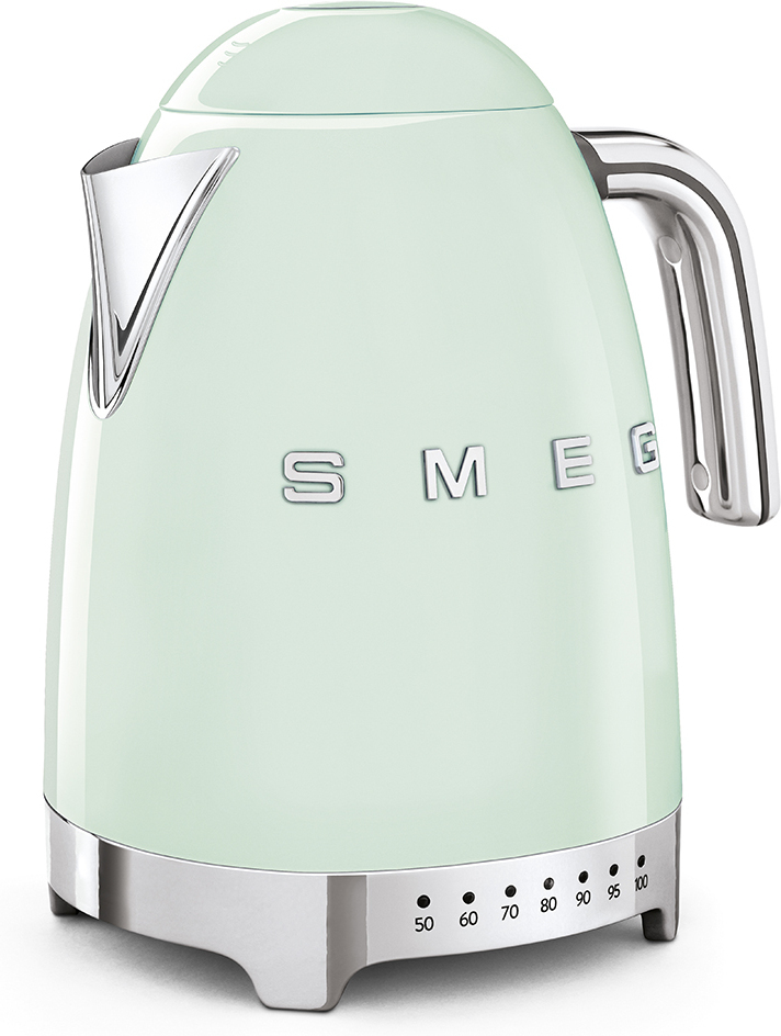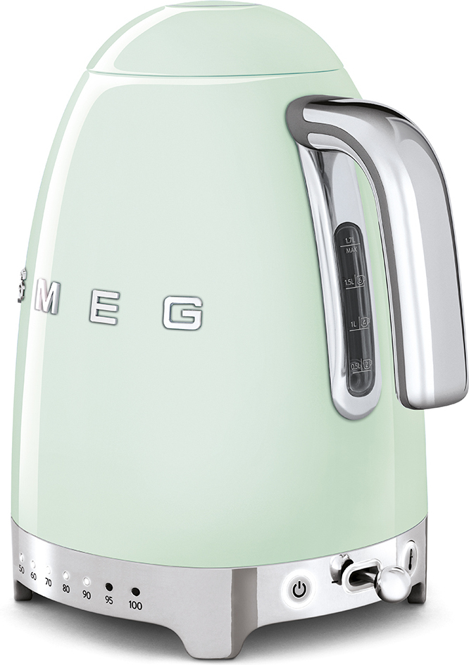 Smegi veekeetja on valmistatud roostevabast terasest ja suudab korraga keeta 1,7 liitrit vett. Stiilse välimuse täiendab kroomitud käepide. Valida saab seitsme erineva temperatuurivaliku vahel: 50º, 60º, 70º, 80º, 90º, 95º, 100ºC.