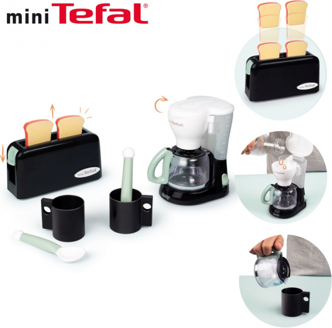 Smoby Tefal hommikusöögikomplekt, mis sisaldab rösterit, kohvimasinat, 2 tassi ja 2 lusikat. Tefali autentsete kodumasinate ustav koopia! Röster mehaanilise funktsiooniga: pärast lüliti vajutamist tulevad röstsaiad automaatselt välja.