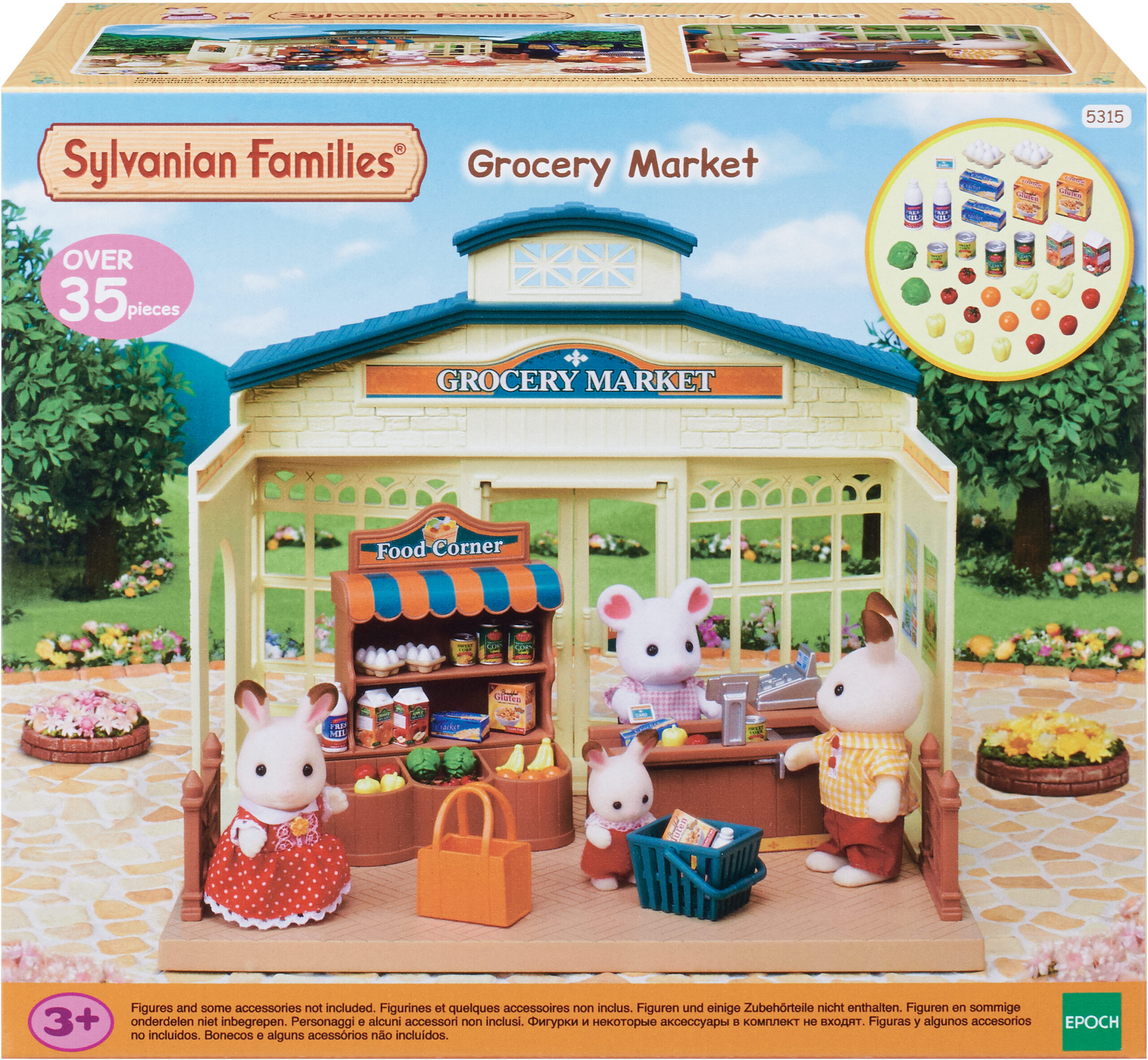 Sylvanian Families supermarket, mis koosneb enam kui 35 osast, sisaldab hoonet, poeriiulit, kassavõrku, 2 ostukorvi ja palju toidukaupu.
