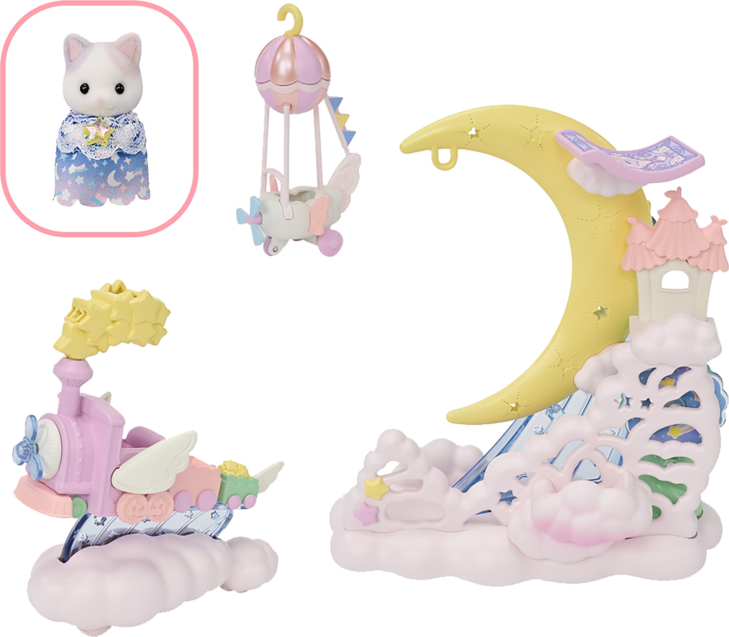 - Kuu õõtsub ja õhulaev, millel beebifiguurid saavad istuda, õõtsub sellega!