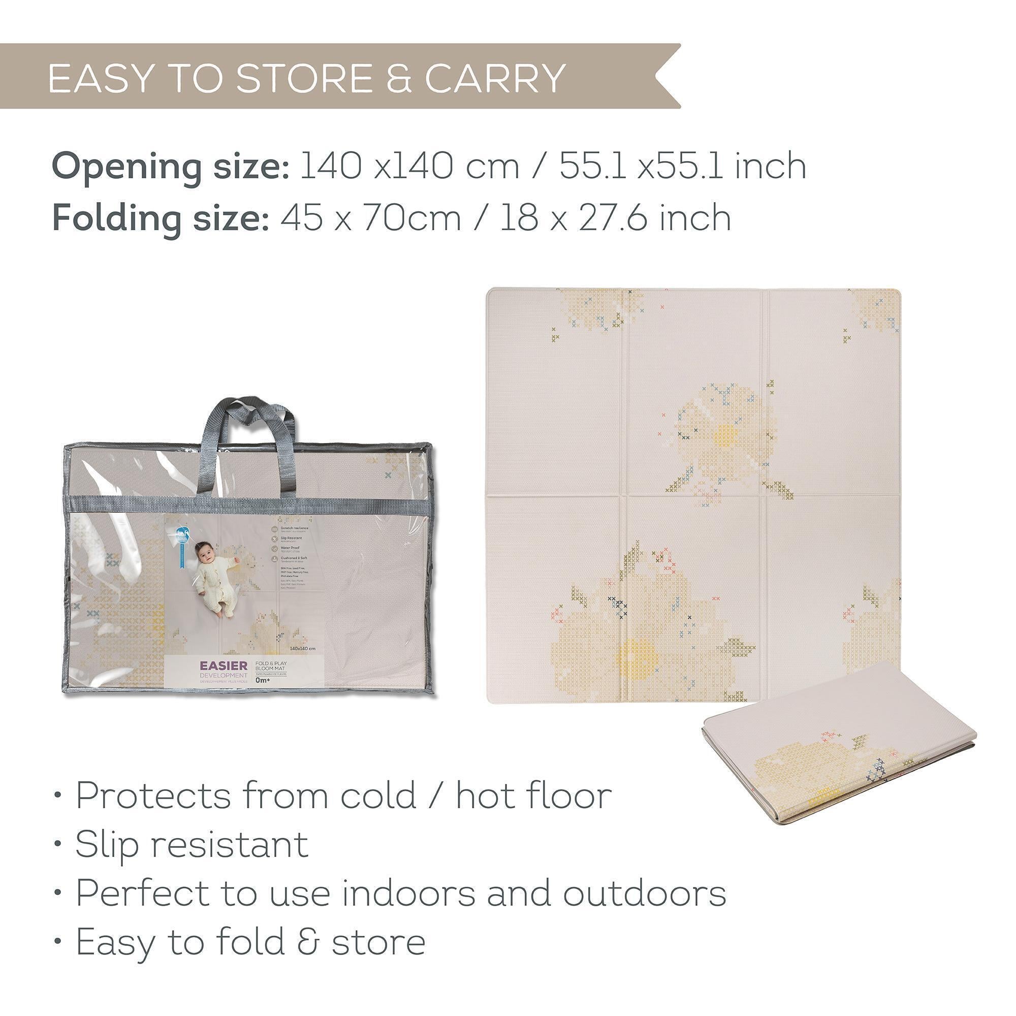 Taf Toys Fold & Play mängumatt pakub pehmet ja libisemiskindlat pinda beebi mängimiseks nii sise- kui ka välistingimustes. Matt on kriimustuskindel ja seda on niiske lapiga lihtne puhastada. Kokkupandav disain muudab selle transportimise ja hoiustamise lihtsaks.