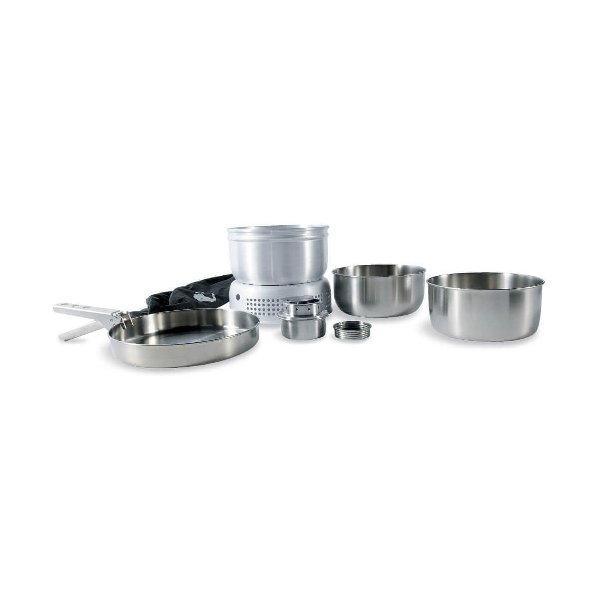 - Kattava ruoanlaittosetti, joka sisältää pannun, kaksi kattilaa, tarttujan, keittotelineen, tuulisuojan ja polttimen.
