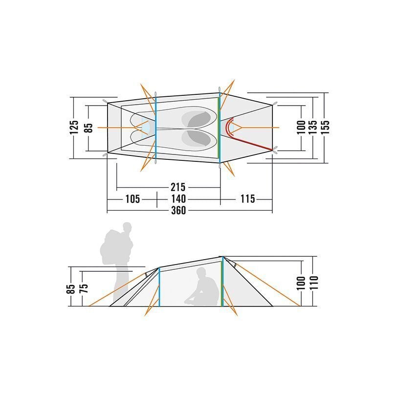 - Materiaali: 68 den Polyester 210T PU (ulkoteltta), 70 den Nylon Ripstop 190T WR (sisäteltta), 70 den Nylon Taffeta 190T PU (pohja)