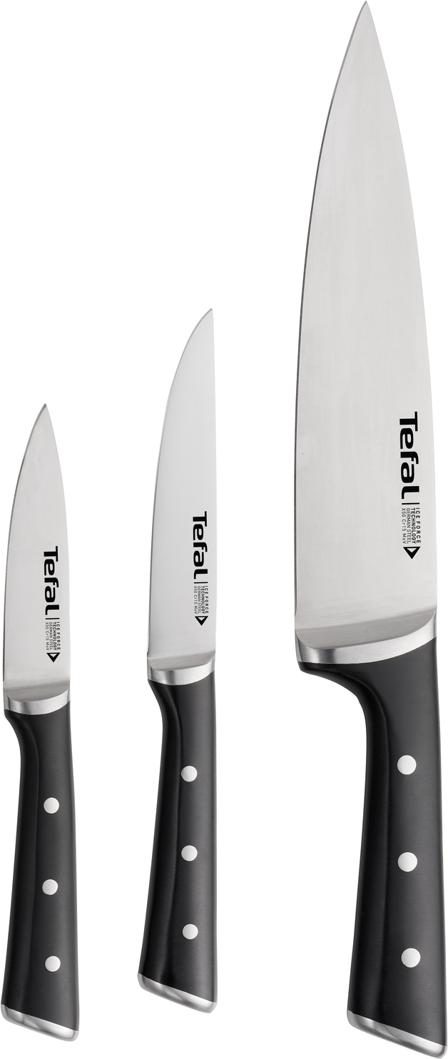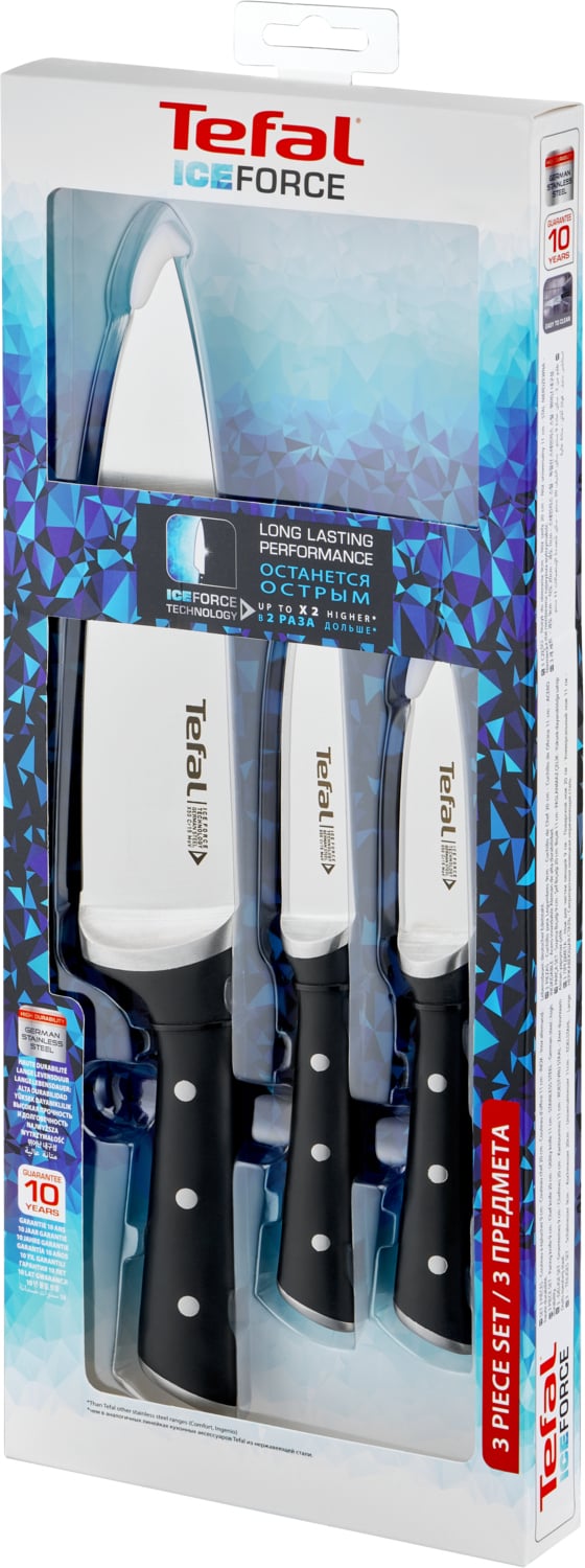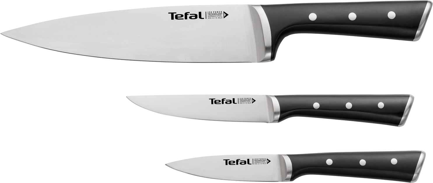 Tefal Ice Force kööginoad lõikavad täpselt. Need ühendavad teravuse, vastupidavuse ja mugavuse, et muuta lõikamine vaevatuks ja anda parimad võimalikud tulemused. Komplekt sisaldab kolme mitmeotstarbelist nuga, nii et leiate endale hõlpsalt sobiva noa. Tefal Ice Force noakomplekt sisaldab kolme nuga: 20 cm kokanuga, 11 cm universaalnuga ja 9 cm koorimisnuga.