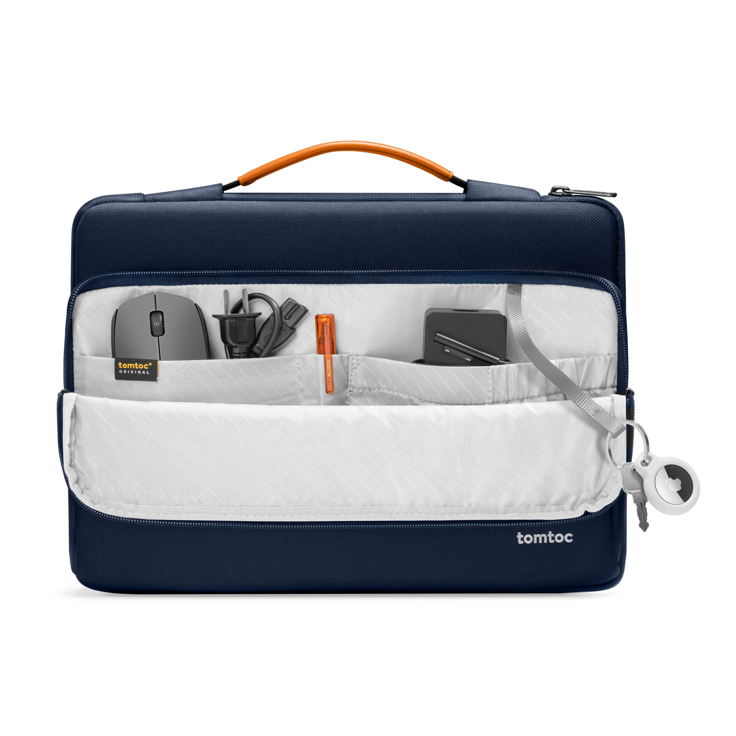 Kannettavan lisäksi Defender‑A14 tarjoaa käytännöllisen etutaskun, johon mahtuvat laturi, kaapelit, AirTag ja avaimet. Takana oleva piilotasku sopii hyvin puhelimen, lompakon tai matkalippujen säilytykseen. Sivulta avautuva vetoketju tekee kannettavan esiin ottamisesta nopeaa ja vaivatonta ilman, että koko suojataskua tarvitsee avata.