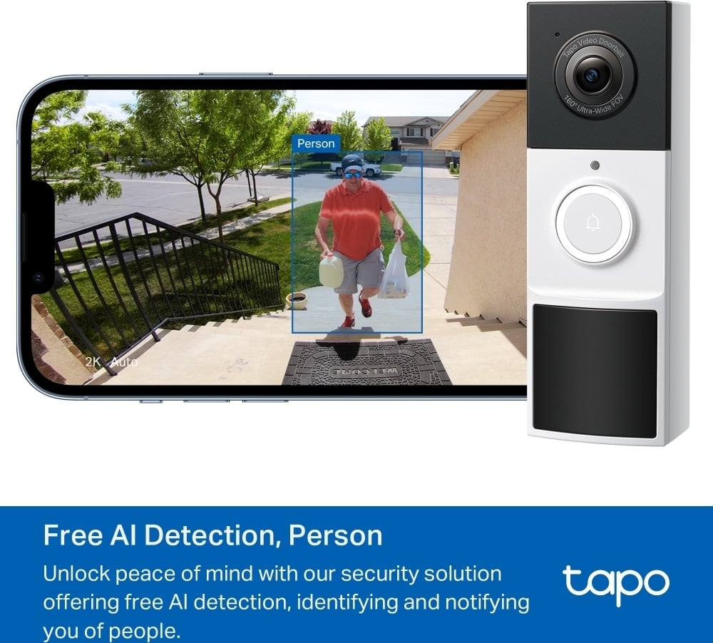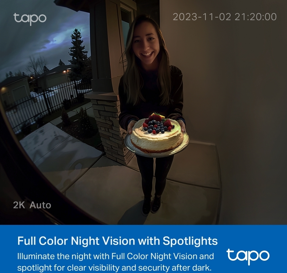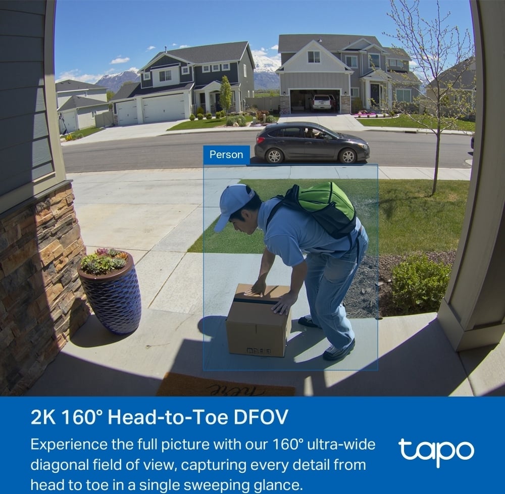 Ulkokäyttöön soveltuvalla TP-Link Tapo D210 -ovikellokameralla näet ja kuulet vieraat ovellasi. Se tarjoaa 2K 3MP tarkkuuden ja 160° näkymän päästä varpaisiin. Tekoälyavusteinen tunnistus ilmoittaa onko oven takana ihminen. Värillinen yökuvaus mahdollistaa kirkkaan näkyvyyden myös pimellä integroitujen spottivalojen avulla. Ääni kulkee kahteen suuntaan: voit viestiä kaiutinmikrofonin kautta vieraille ovea avaamatta.