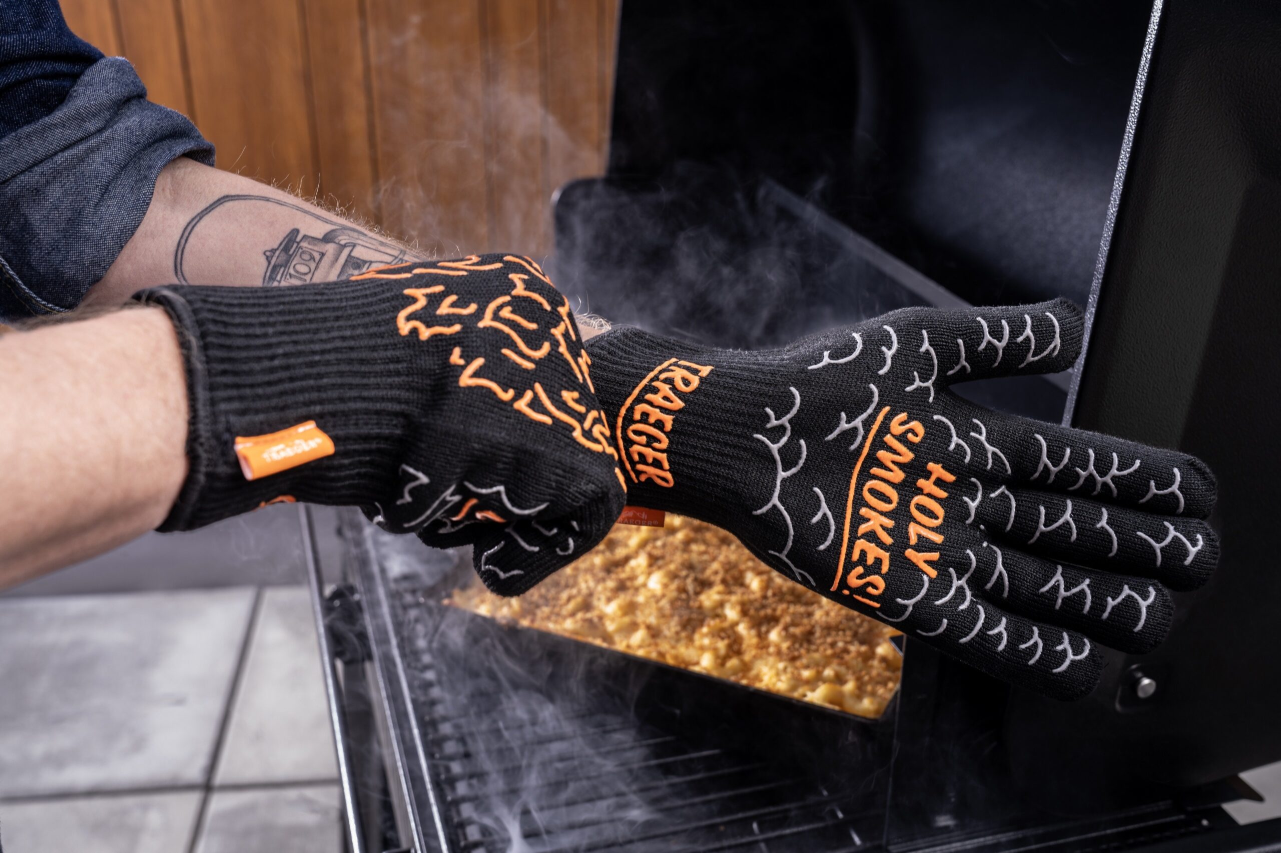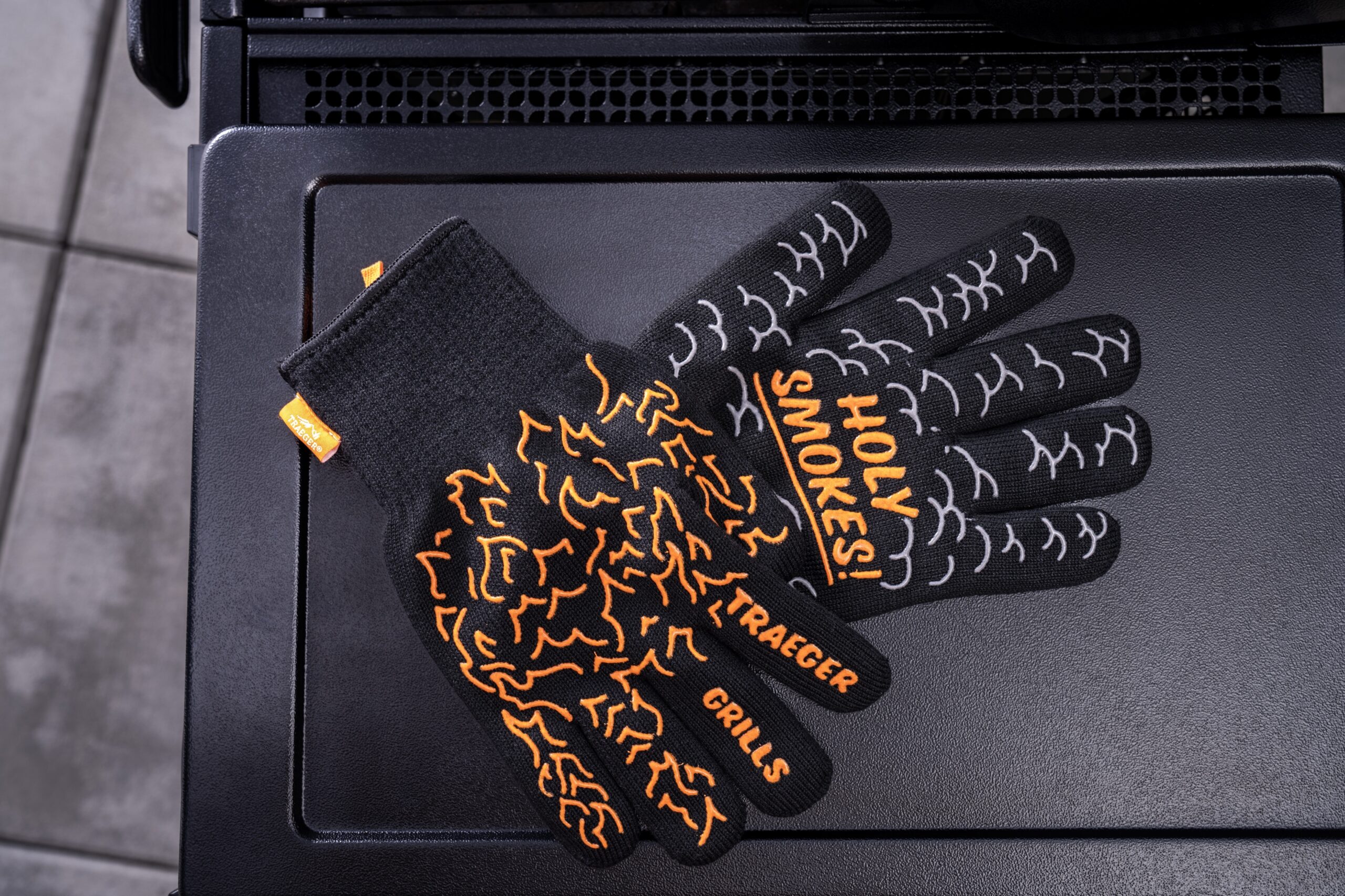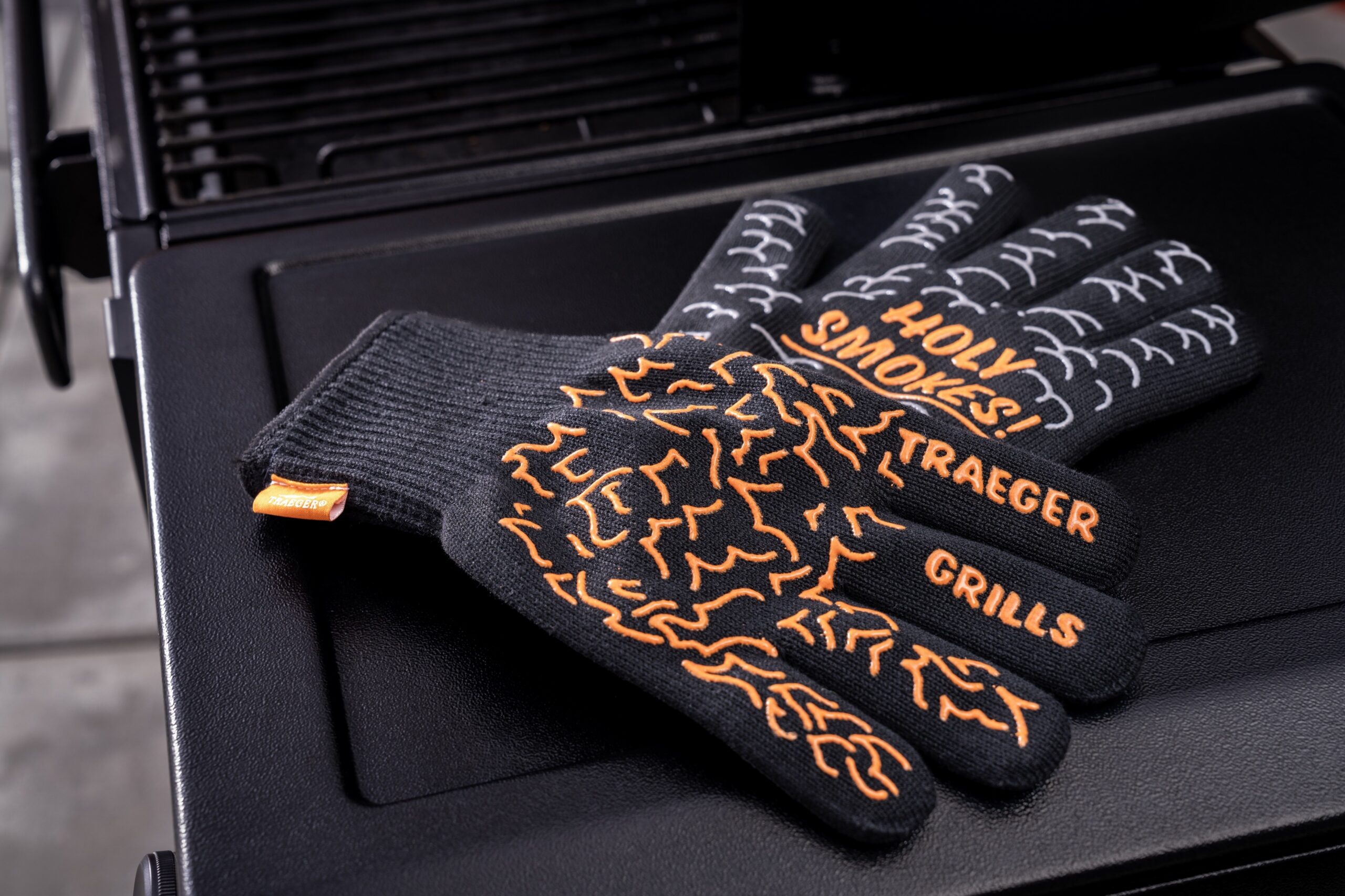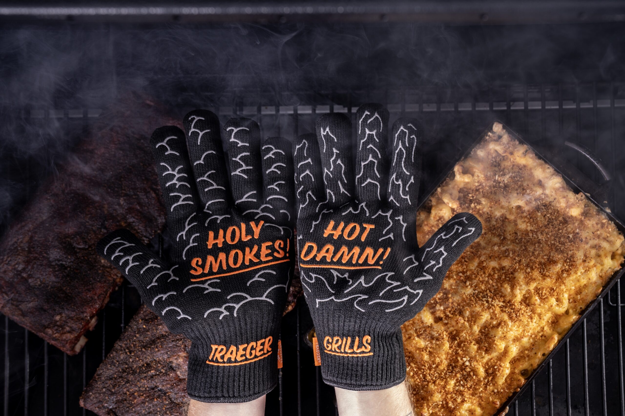Hanskat on tarkoitettu käytettäväksi Traeger-grillien kanssa, mutta ne soveltuvat myös muiden grillien käsittelyyn, joissa tarvitaan suojaa kuumilta pinnoilta.